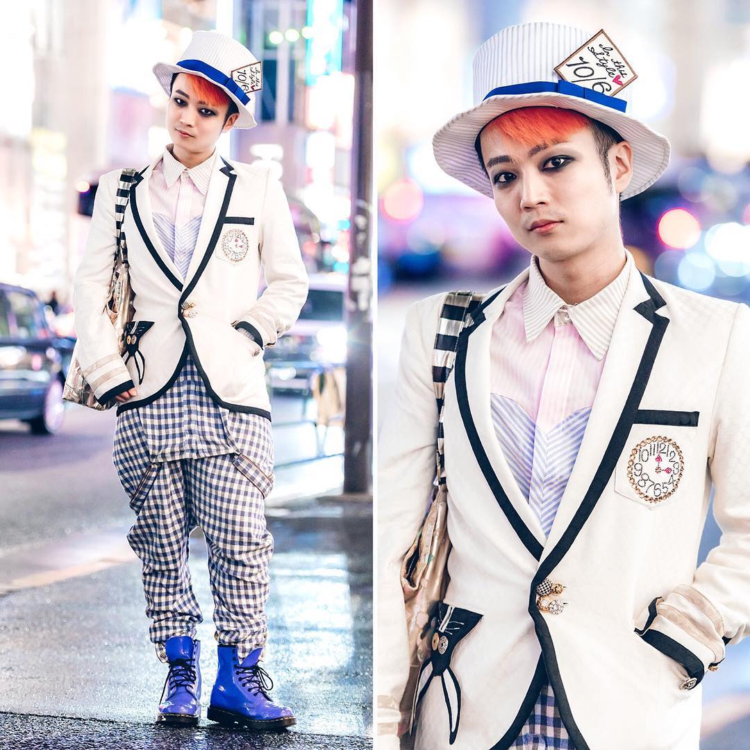 Japanese DJ and musician Ohshi Uemoto (@oshy_wu) on the street in Harajuku wearing a Mad Hatter inspired style with fashion by Malko Malka and Dr. Martens boots.