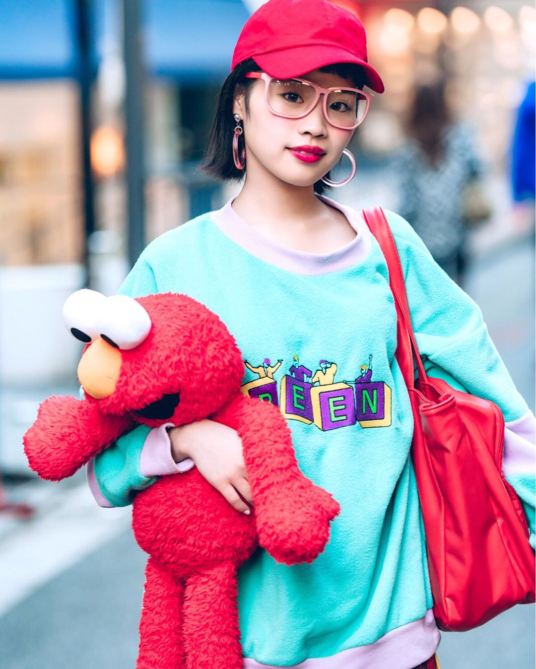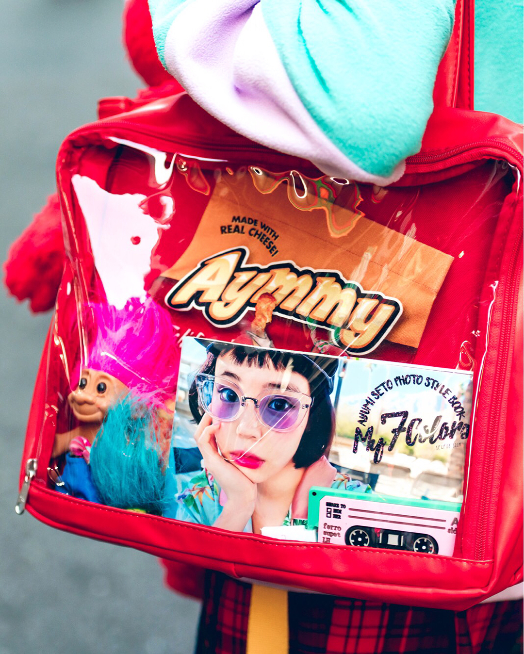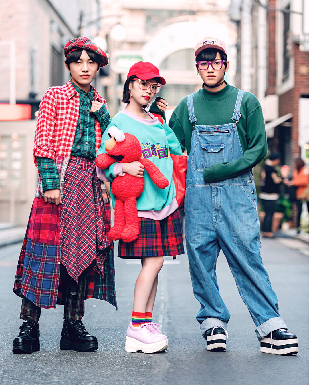 Japanese teens Boll (@boll_0901), Zukinchan (@zukin333), and Mathi (@mathi__xox) on the street in Harajuku wearing color coordinated styles with fashion by Punyus, WEGO, Spinns, Aymmy, Yosuke, Sevens, and Elmo.