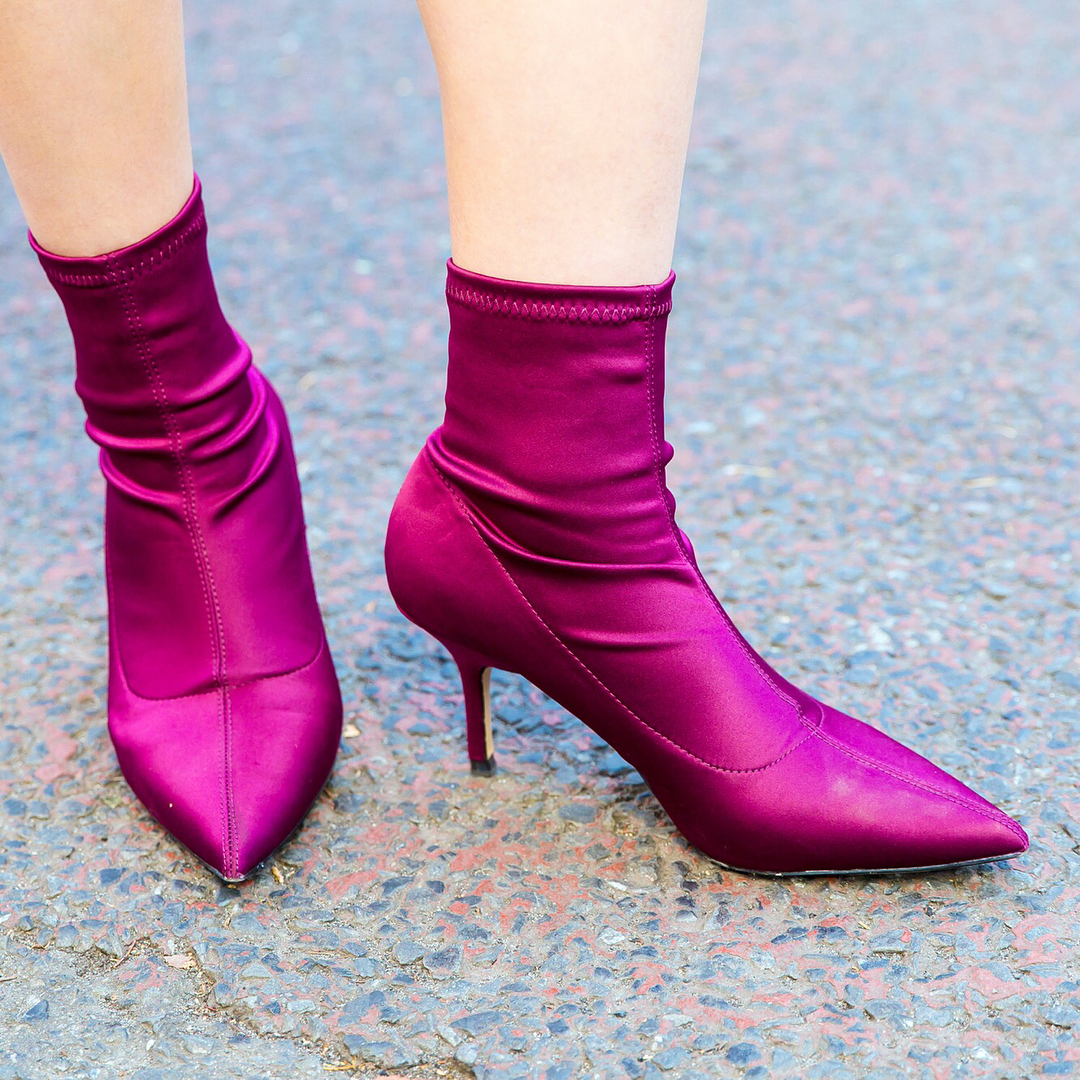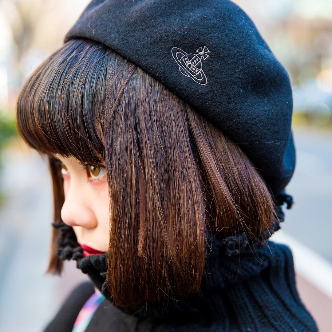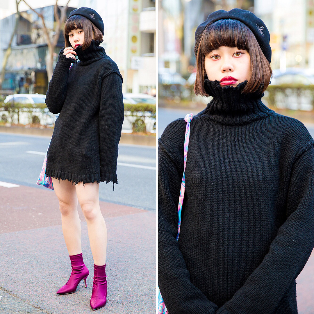 18-year-old Japanese student Sarah (@i_am_saaara) on the street in Harajuku wearing a Perverze turtleneck sweater with a Vivienne Westwood beret, UNIF bag, and Zara fuchsia heels.
