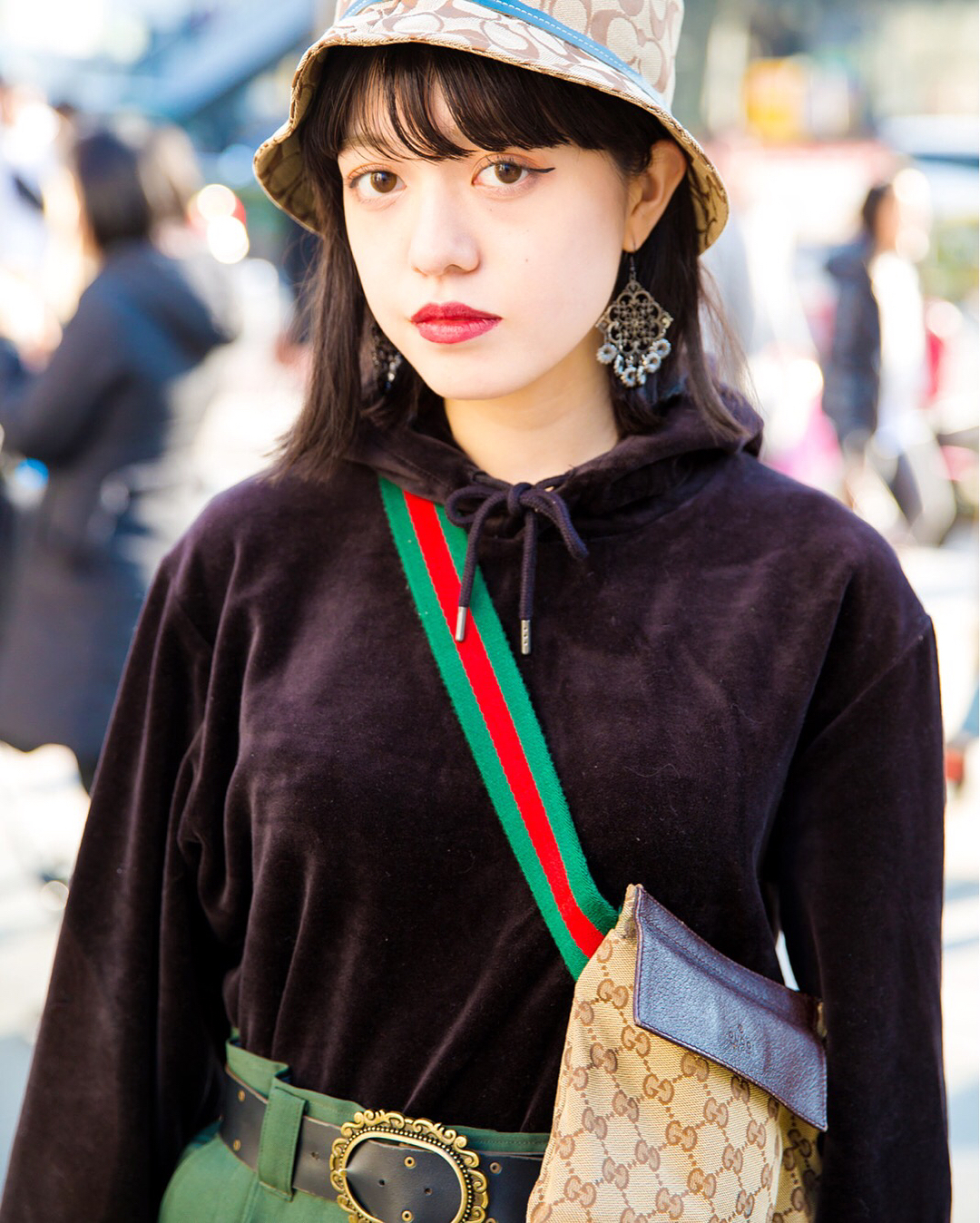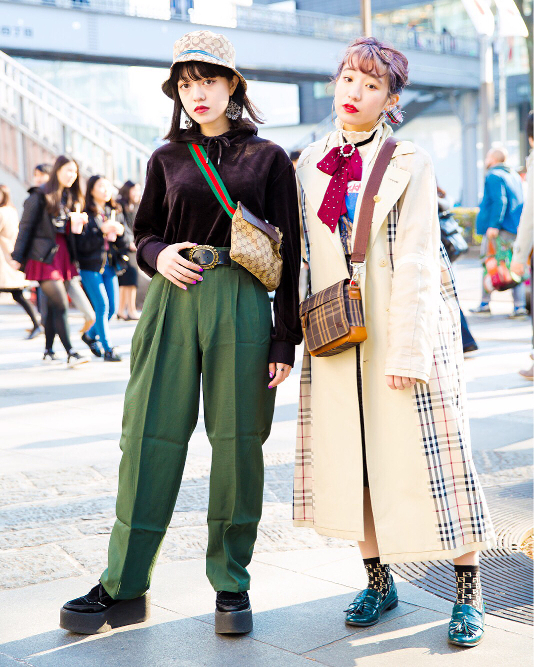 19-year-old Japanese students Aoi (@aoi_kkk) and Raika (@c5raimetalc5) on the street in Harajuku wearing vintage fashion along with items from New York Joe, @Atereco_Vintage, Gucci, Coach, Nadia Harajuku, Burberry, and Zara.