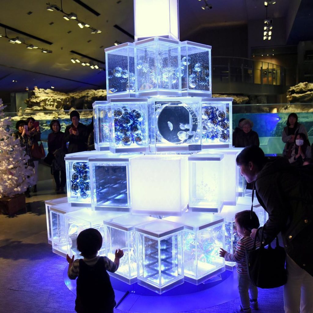 Fish tanks with kurage (jellyfish) inside, arranged in the shape of a Christmas tree, are illuminated Thursday at Sumida Aquarium in Tokyo. Called the Tokyo Kurage Tree, the display will open to the public on Friday. 🎄 🎄 🎄 (Satoko Kawasaki photo) #jellyfish #sumida #sumidaquairum #christmas #christmastree #クリスマス #隅田 #クラゲ