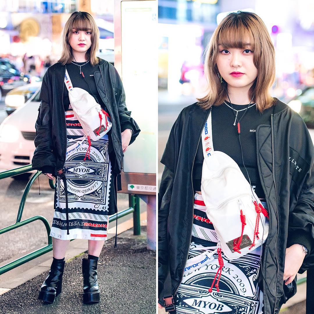 19-year-old Moeka (@___mo_e___) on the street in Harajuku wearing a bomber jacket, skirt, and bag all by the Japanese streetwear brand MYOB NYC, along with a More Than Dope top, YRU platforms, and Vivienne Westwood accessories.