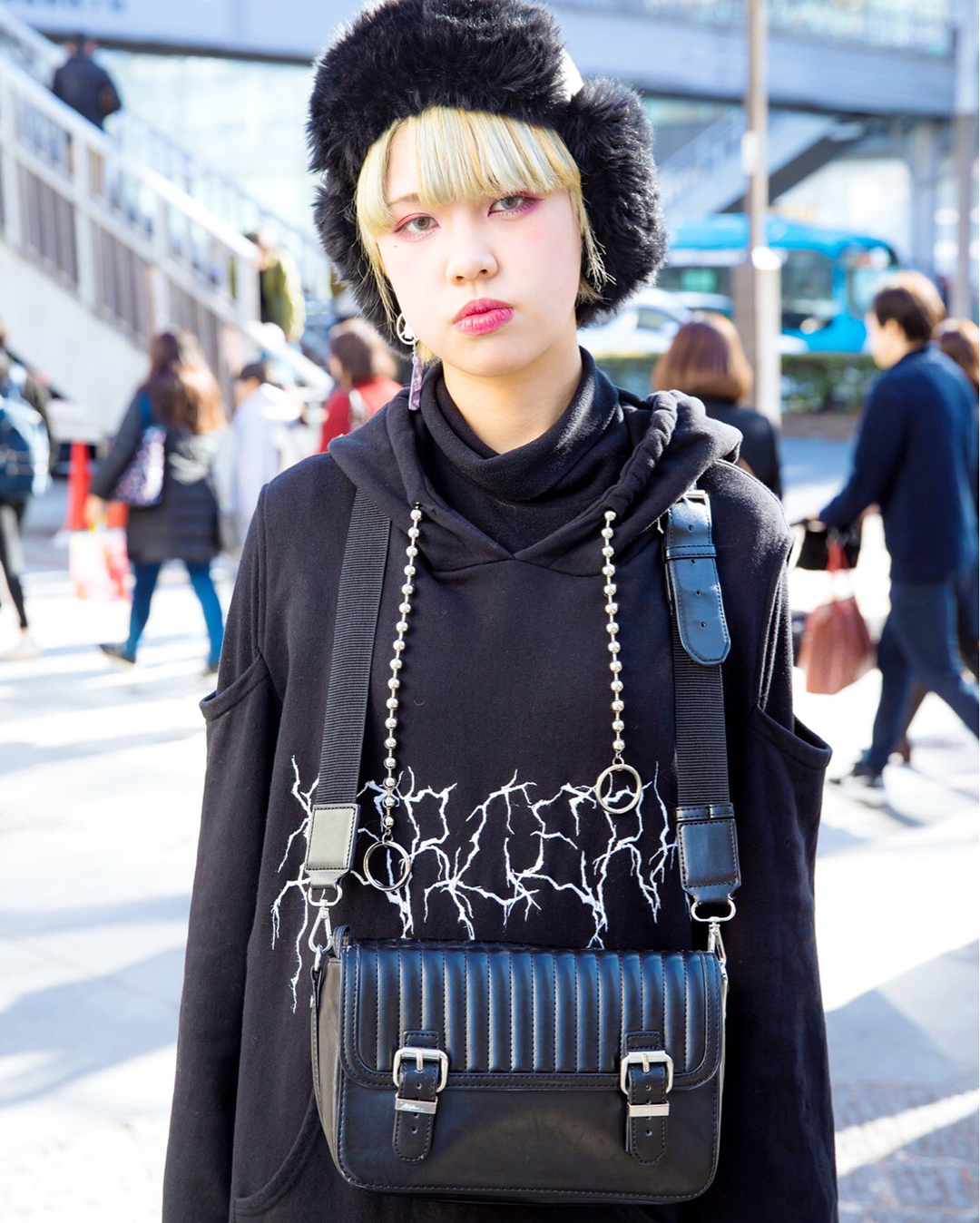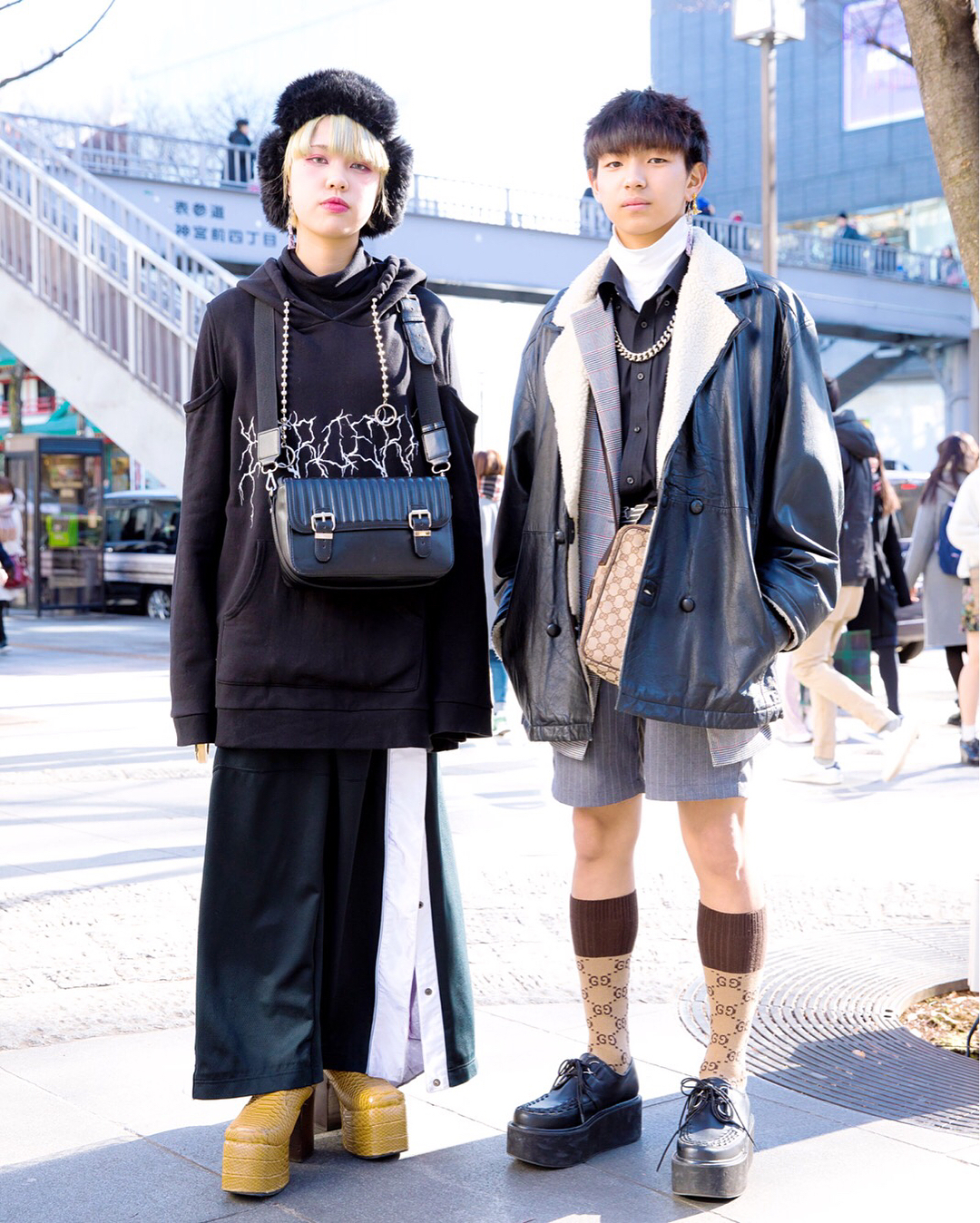 16-year-old Japanese students Sagumo (@sagumo6854) and Mahiro (@qqq_hs) on the street in Harajuku wearing mostly monochrome street styles with items from BERCERK, London Boots, M.Y.O.B., Gucci, Yosuke, and L.H.P.