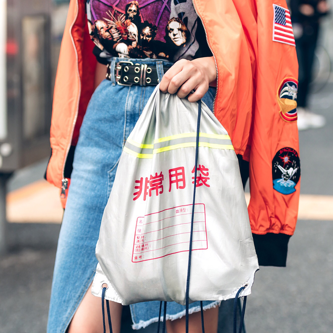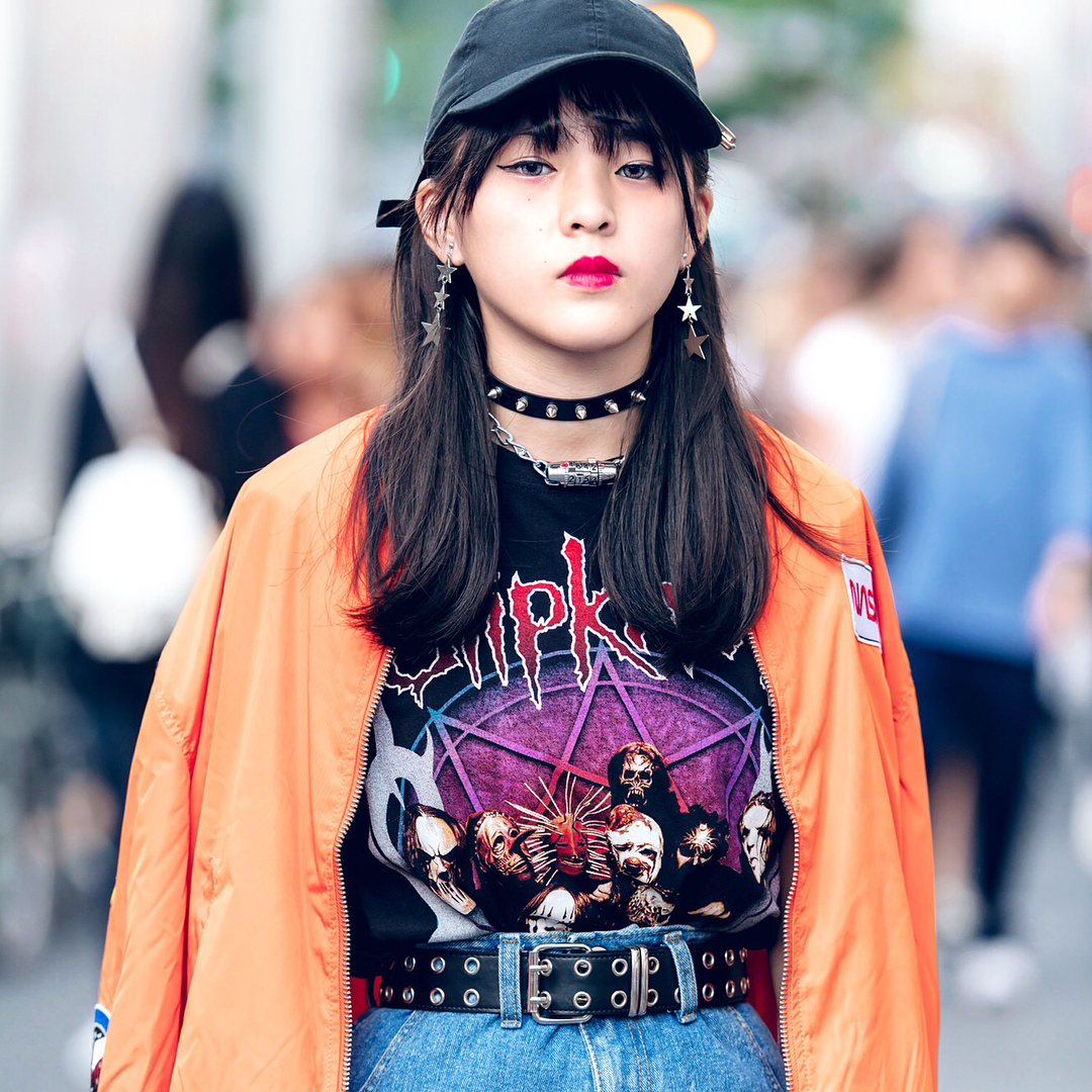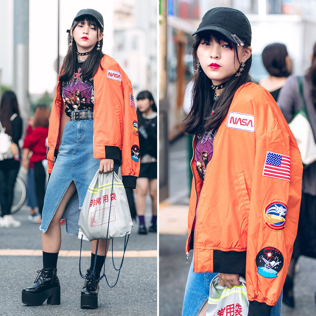 15-year-old Japanese student Kaya (@hg0_an) on the street in Harajuku wearing a NASA bomber jacket over a Slipknot band tee, a denim skirt by Open The Door, and Bubbles Harajuku platform boots.