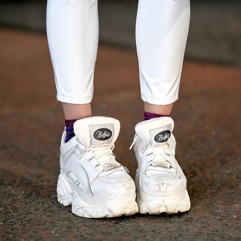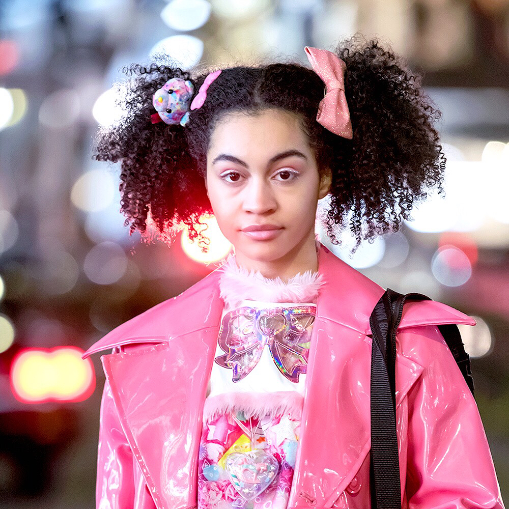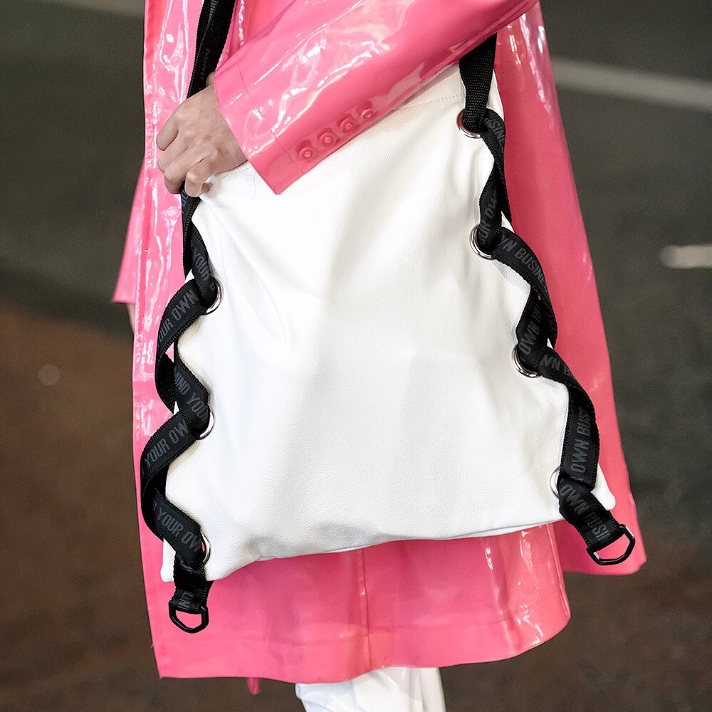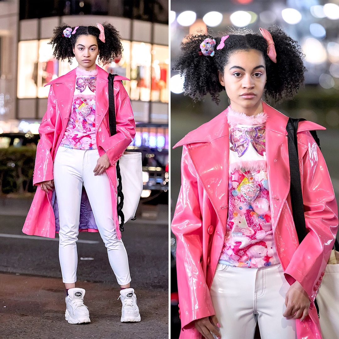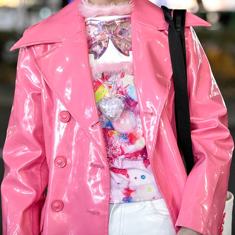 Choom (@choom.online) – who works at the famous kawaii Harajuku boutique 6%DOKIDOKI – on the street in Harajuku wearing a vintage pink vinyl coat over a 6%DOKIDOKI top, a Kiss Me Kill Me shrug, white vinyl pants, Buffalo platforms, and a bag by Japanese streetwear brand MYOB NYC.