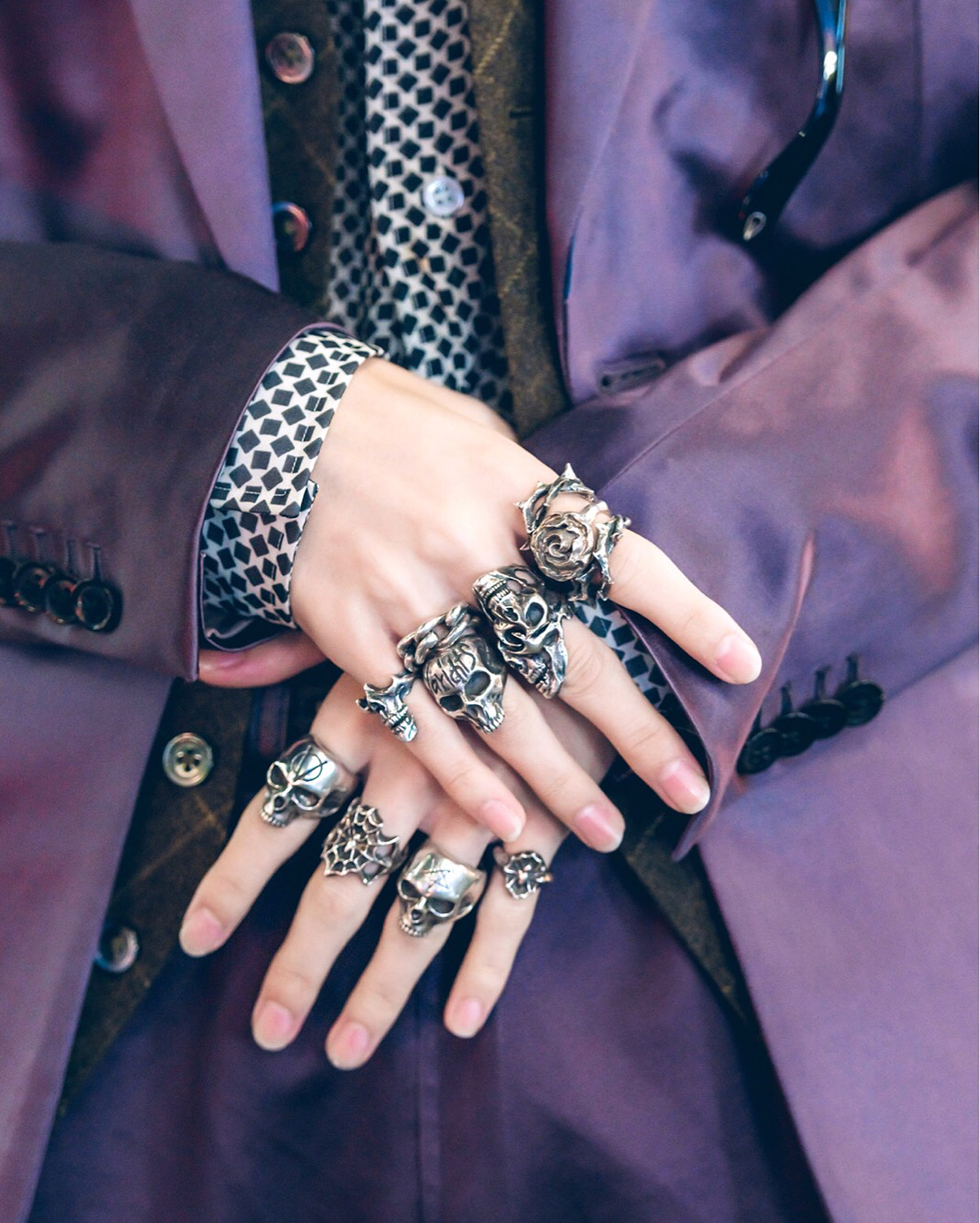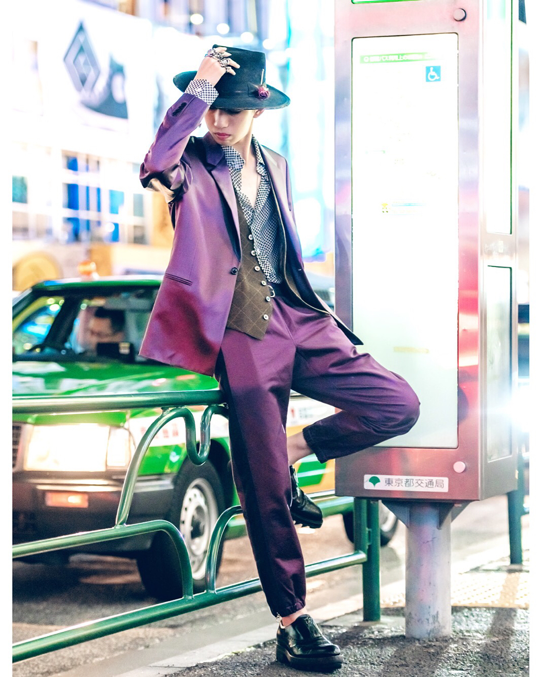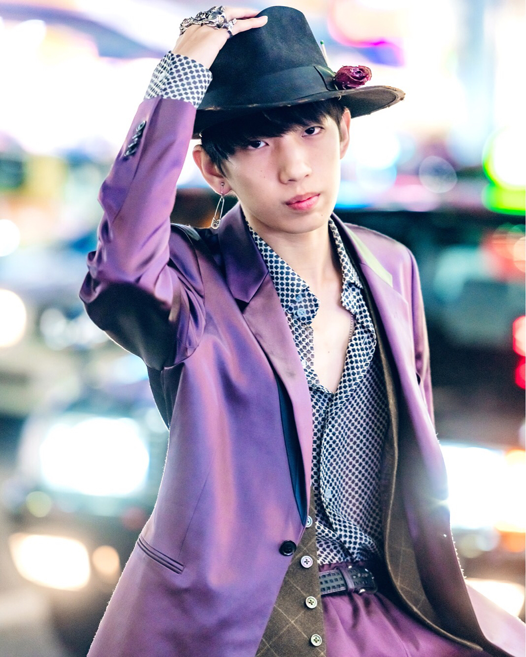 Japanese student Ryunosuke (@ryunosuke_ishimitsu) on the street in Harajuku wearing a purple Paul Smith suit over a YSL shirt, dress shoes, silver rings, and a Nick Fouquet fedora.