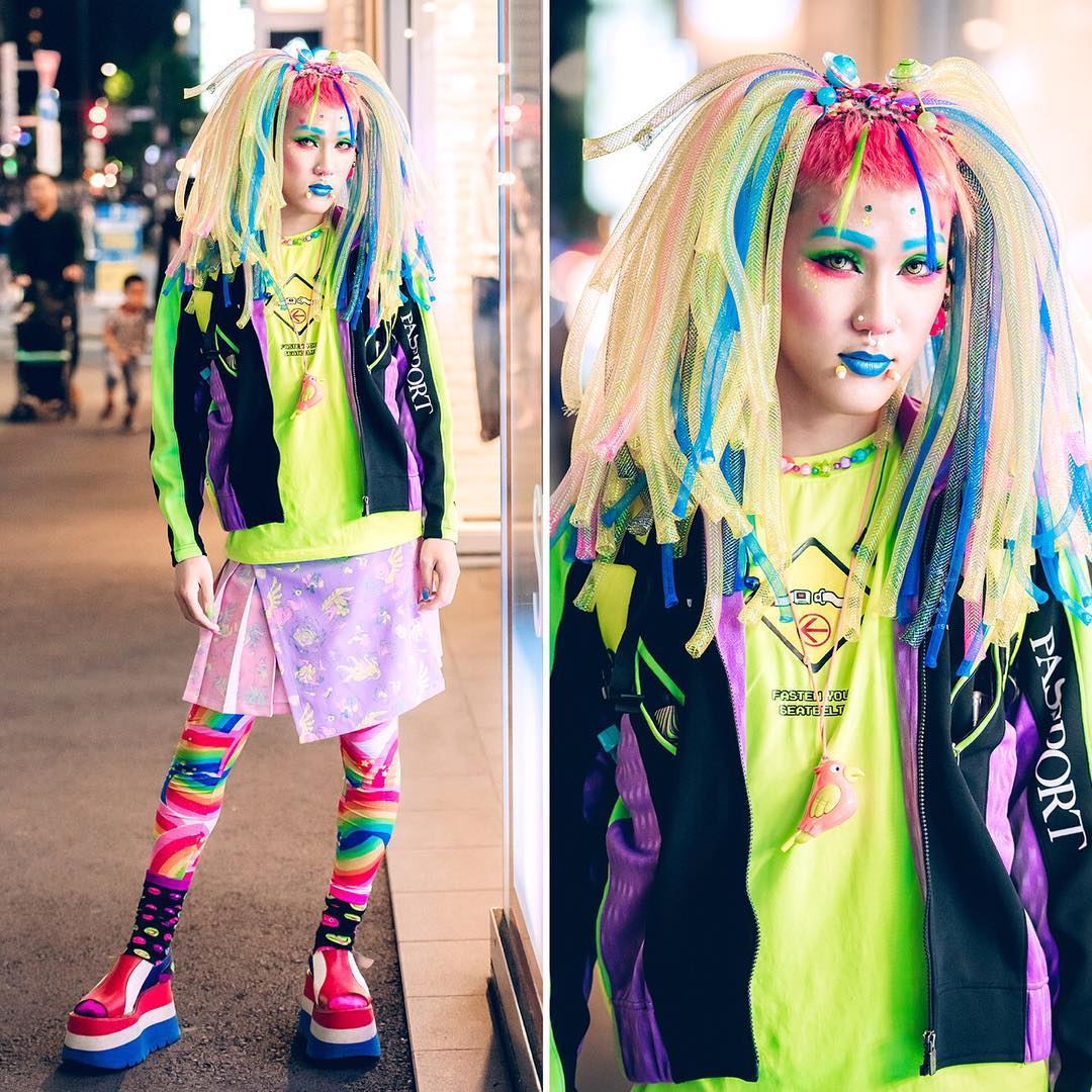 Kanata (@KANATA.CIRCLEK) on the street in Harajuku wearing a super colorful style with rainbow cyber hair falls, a Cyberdog top, 6%DOKIDOKI leggings, platforms, and 6%DOKIDOKI accessories. He works at 6%DOKIDOKI (@6doki_official)!