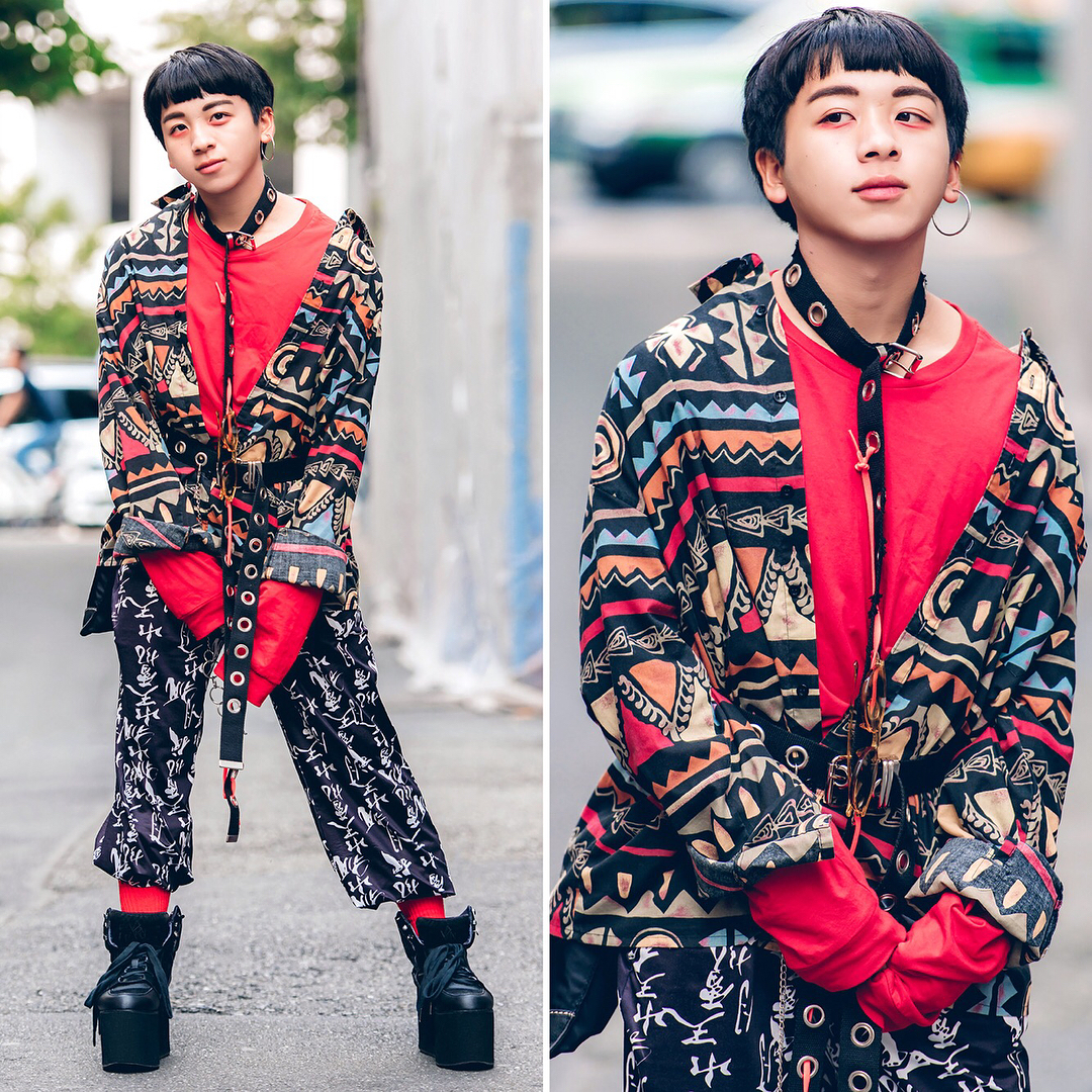 16-year-old Akky (@a_a_a_stay) on the street in Harajuku wearing mixed prints fashion from various Tokyo vintage shops along with YRU platform shoes. Tokyo FashionAloJapan.com