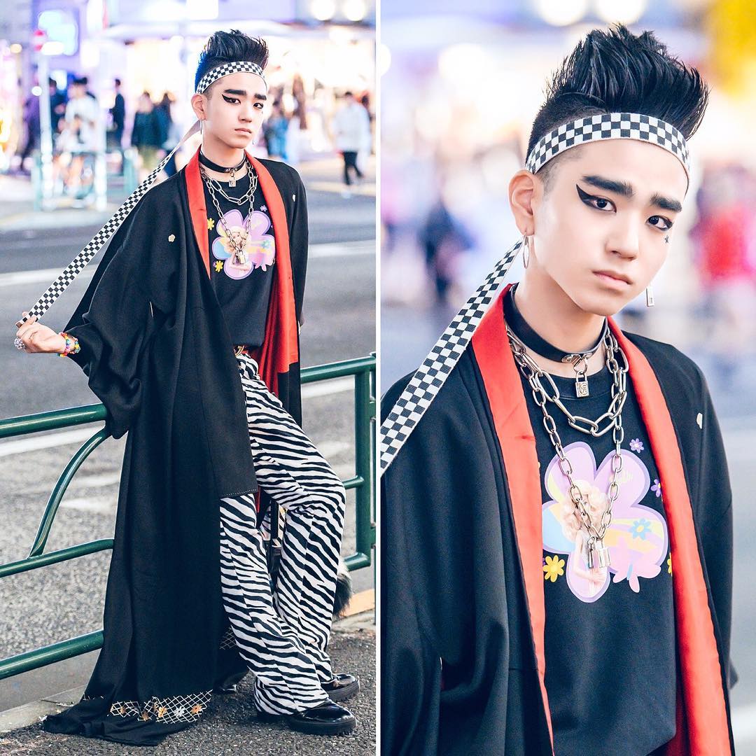 16-year-old Japanese student BilliMayu (@mayu_fancy) on the street in Harajuku wearing a kimono coat from Chicago (the name of a Tokyo vintage shop) , a Peco Club t-shirt, zebra striped pants from WC Harajuku, patent shoes, and Romantic Standard accessories.