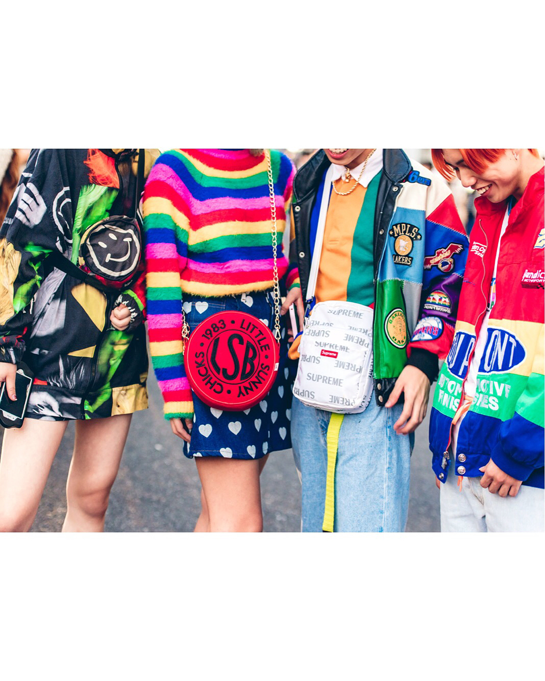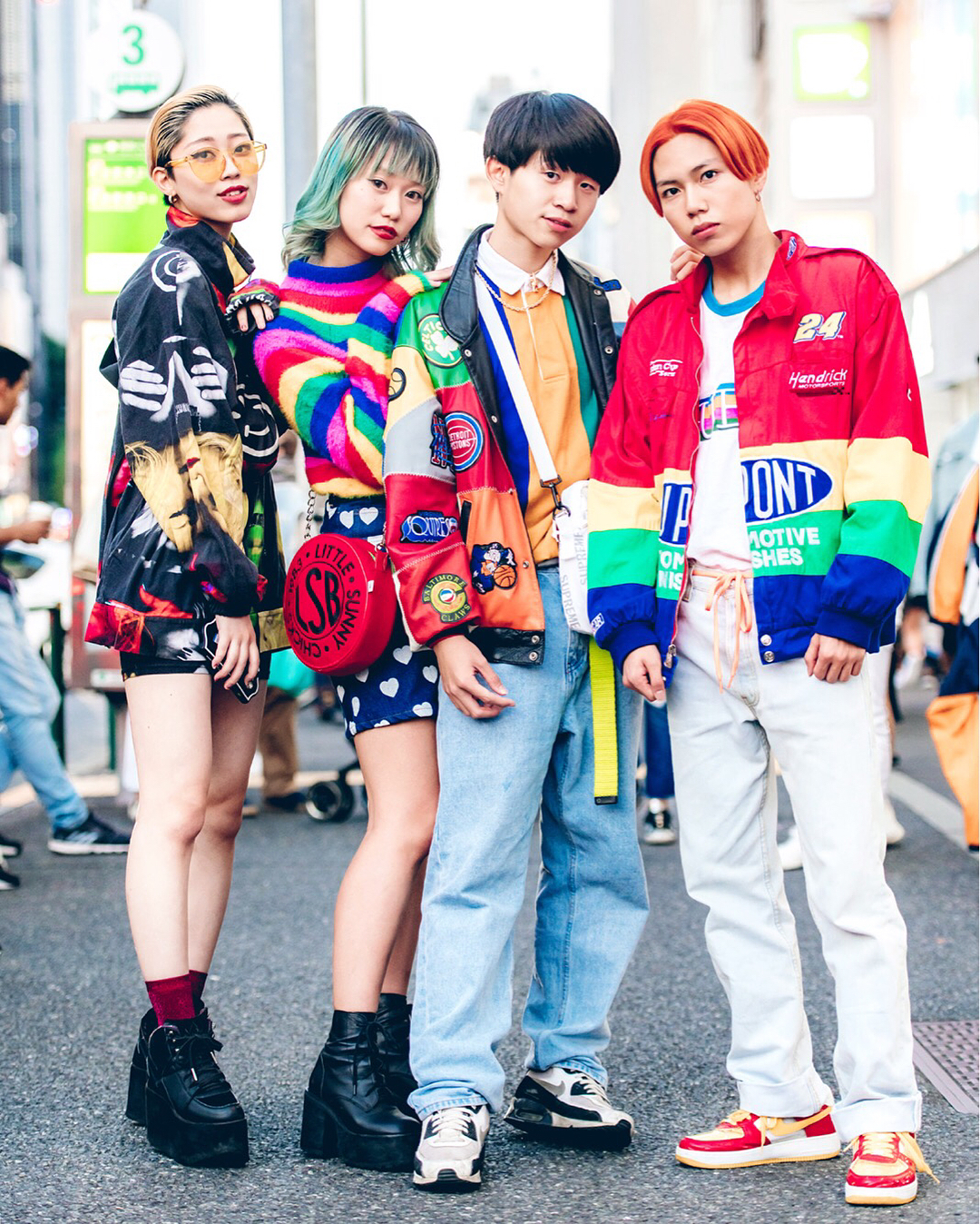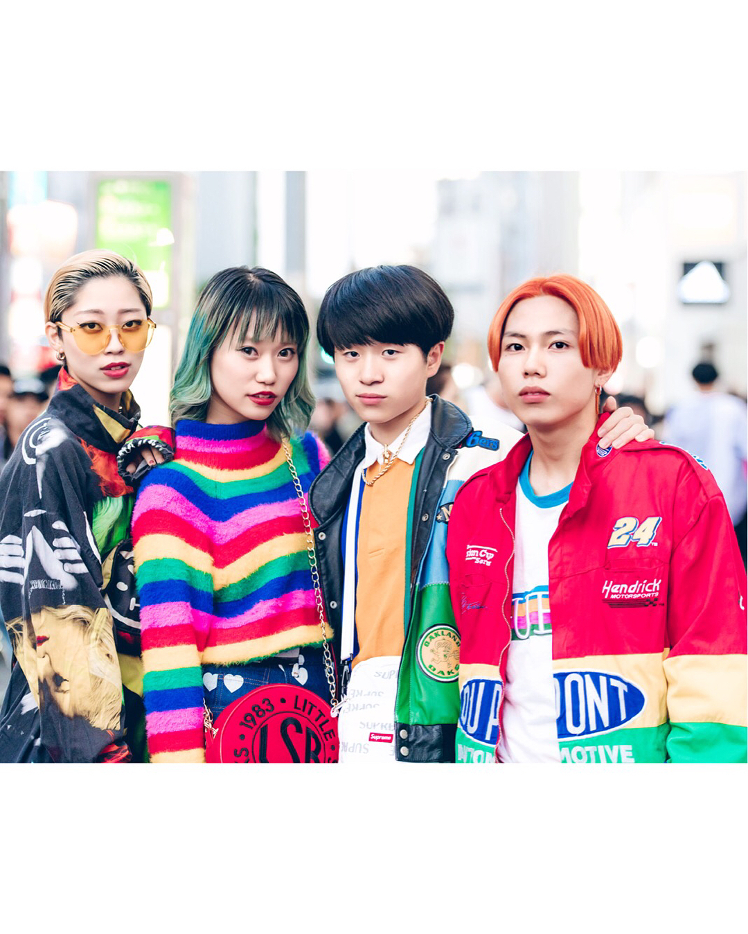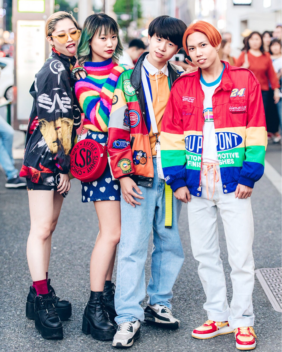 Friends Rio Monster (@riomonster), Natsuko (@_natsumagic_), Taiyou (@sunnytaiyou), and Sotaro (@sotarogram_328) on the street in Harajuku wearing colorful styles with fashion by Nieuw Jurk, Little Sunny Bite, Supreme, Moschino, YRU, Candy Stripper, UNIF, Pinnap, Guess, and Levi’s.