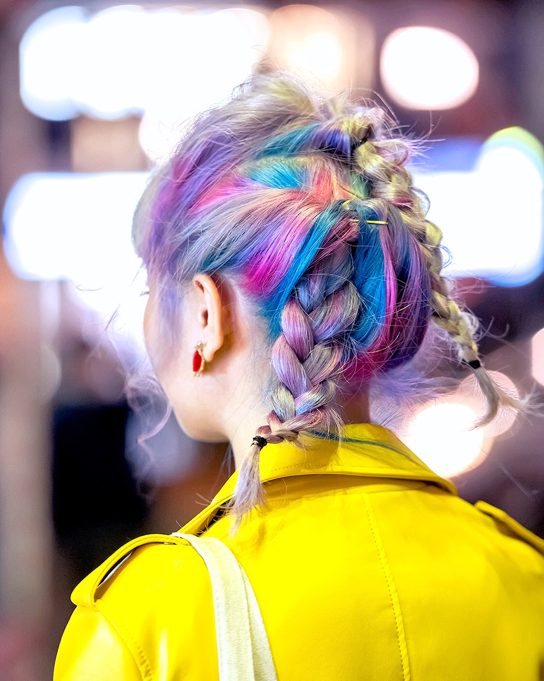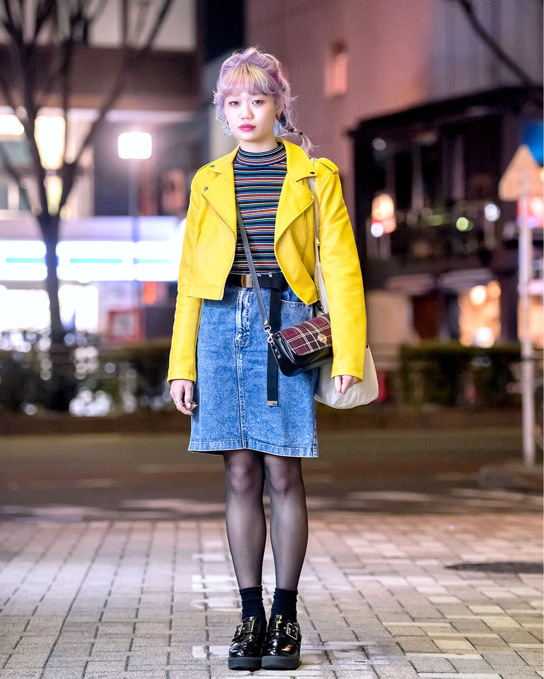 Elleanor (@elleanor1222) on the street in Harajuku after dark wearing a yellow leather jacket over a Bubbles top, a vintage belted denim skirt, Bershka patent buckle shoes, and a Fred Perry plaid purse. Swipe left to see Elleanor’s colorful hairstyle!