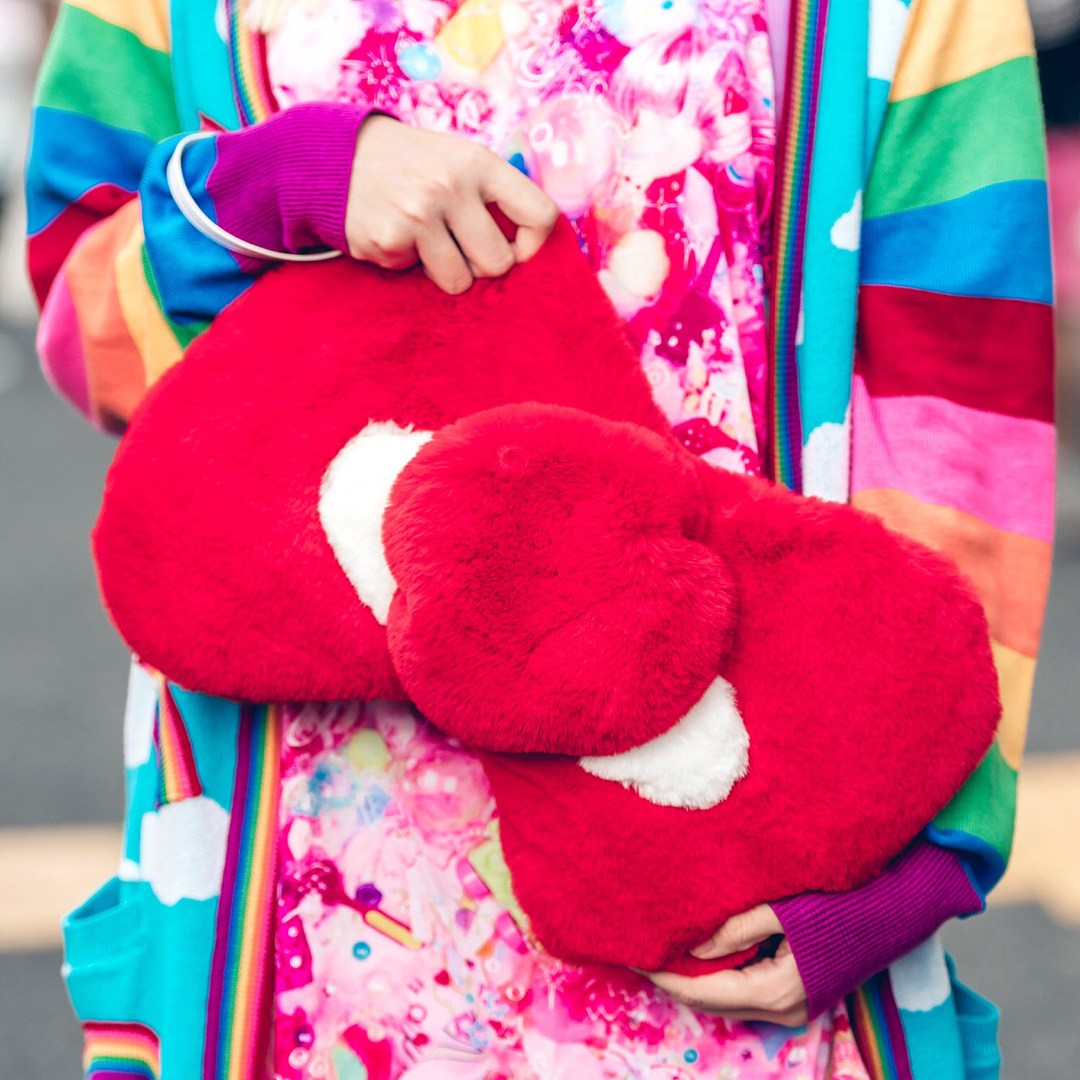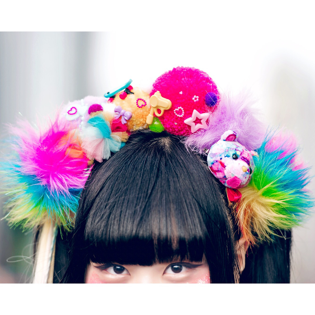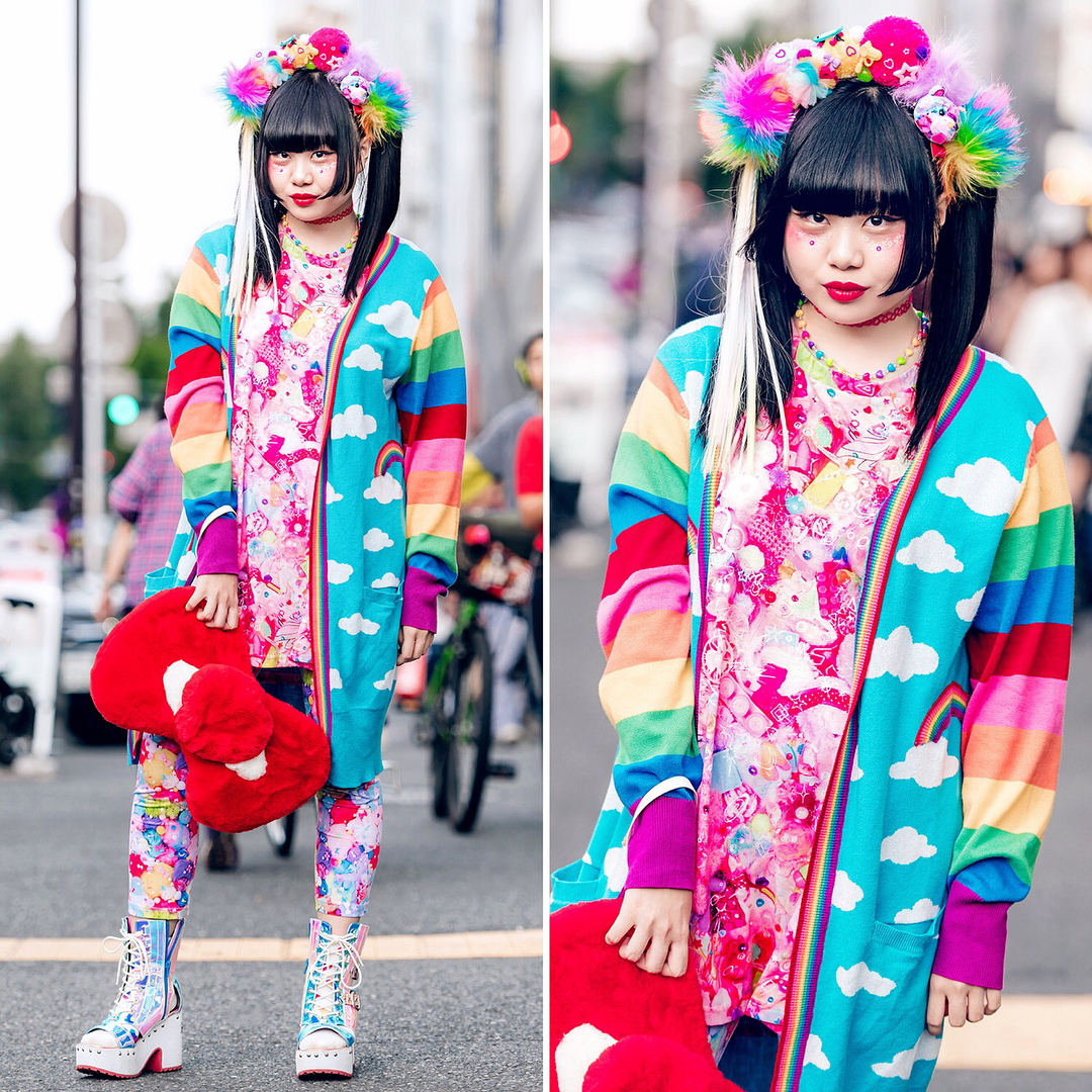 Japanese art student Chami (@chami8725) on the street in Harajuku wearing a kawaii colorful look with a handmade headpiece, Hello Kitty x Merry Jenny plush bag, 6%DOKIDOKI, Galaxxxy Japan, and Yosuke.