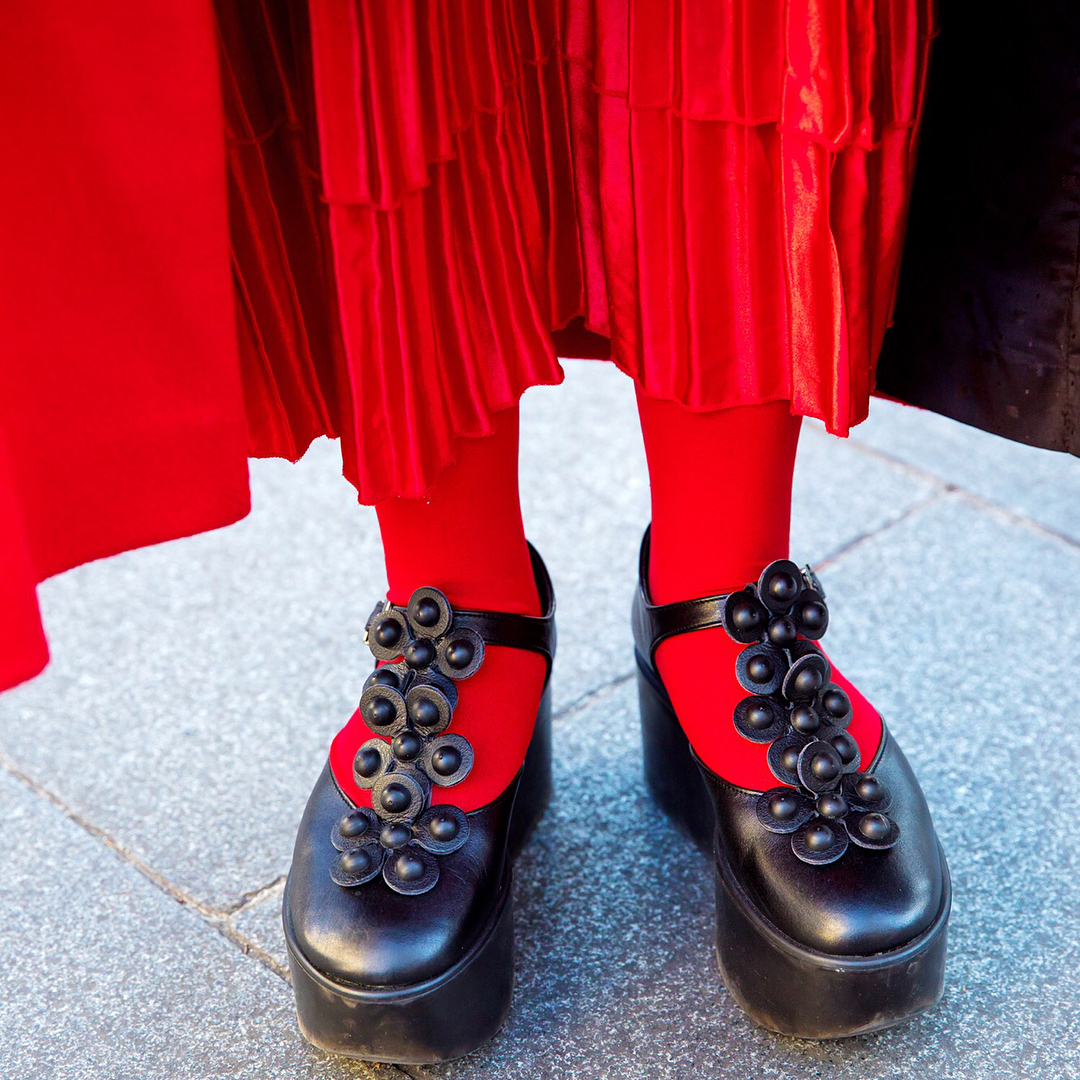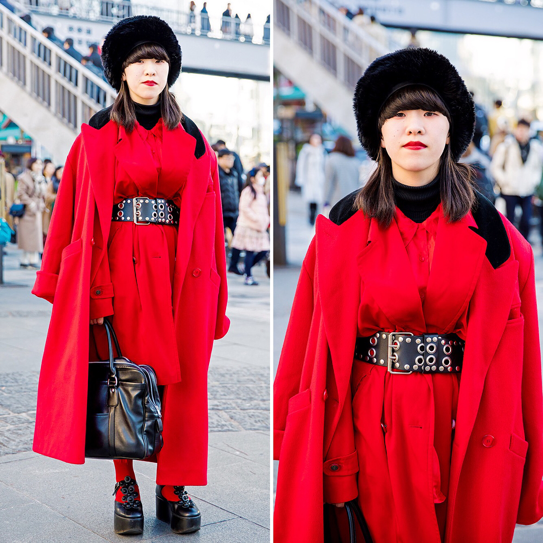 Satoko (@sato1024kr) on the street in Harajuku wearing a red and black Japanese winter street style with items by Otoe, Comme Des Garcons, and Tokyo Bopper.
