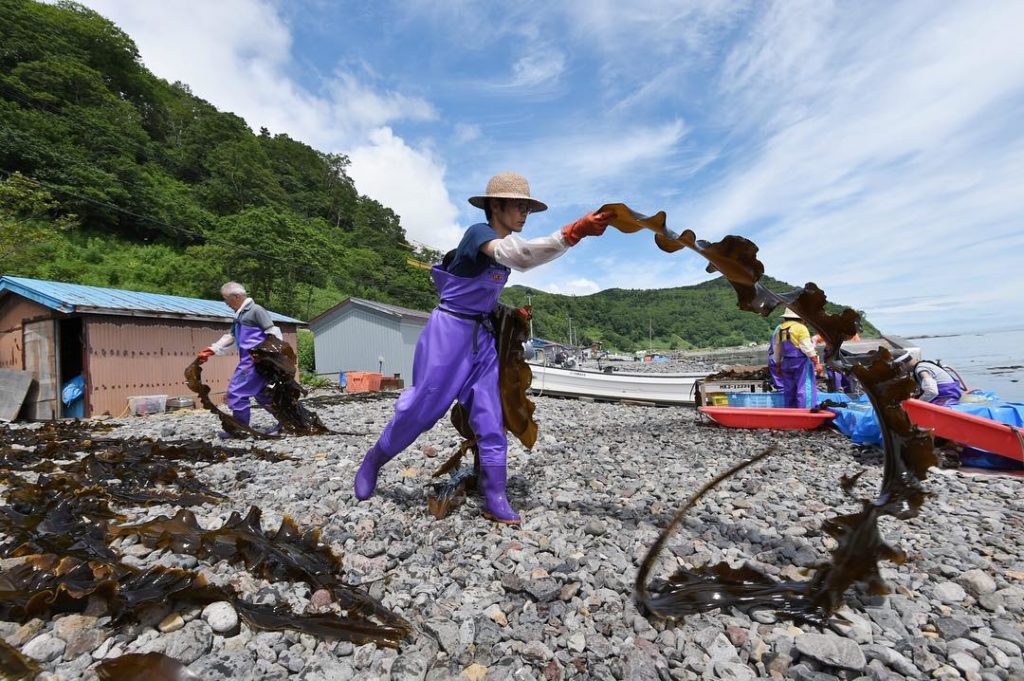 Dried in the wild: A worker lays freshly gathered “konbu” (kelp) on the beach rocks in Rausu, a fishing village in Eastern Hokkaido. After aging, the konbu is laid out on the rocky beach to dry again in the sun, a process called “hi-ire” (putting in the sun), which is done by all Rausu’s kelp producers. (Kenji Miura photo) #Japan #Hokkaido #北海道 #羅臼 #昆布