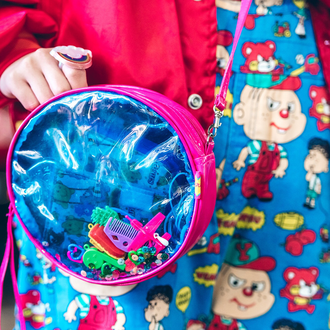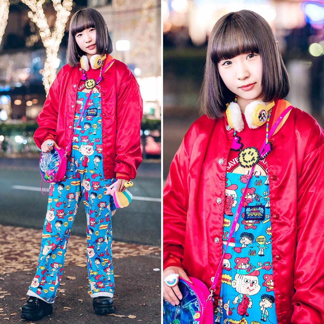 18-year-old Ribonchan (@rion_tky83) – a Japanese student and Kyary Pamyu Pamyu fan – on the street in Harajuku wearing a kawaii look with comic print overalls from Grand Ground, a vintage jacket from Kinji, a Spinns sweatshirt, Yosuke platforms, accessories from Spiral Toy Shop, and handmade items.