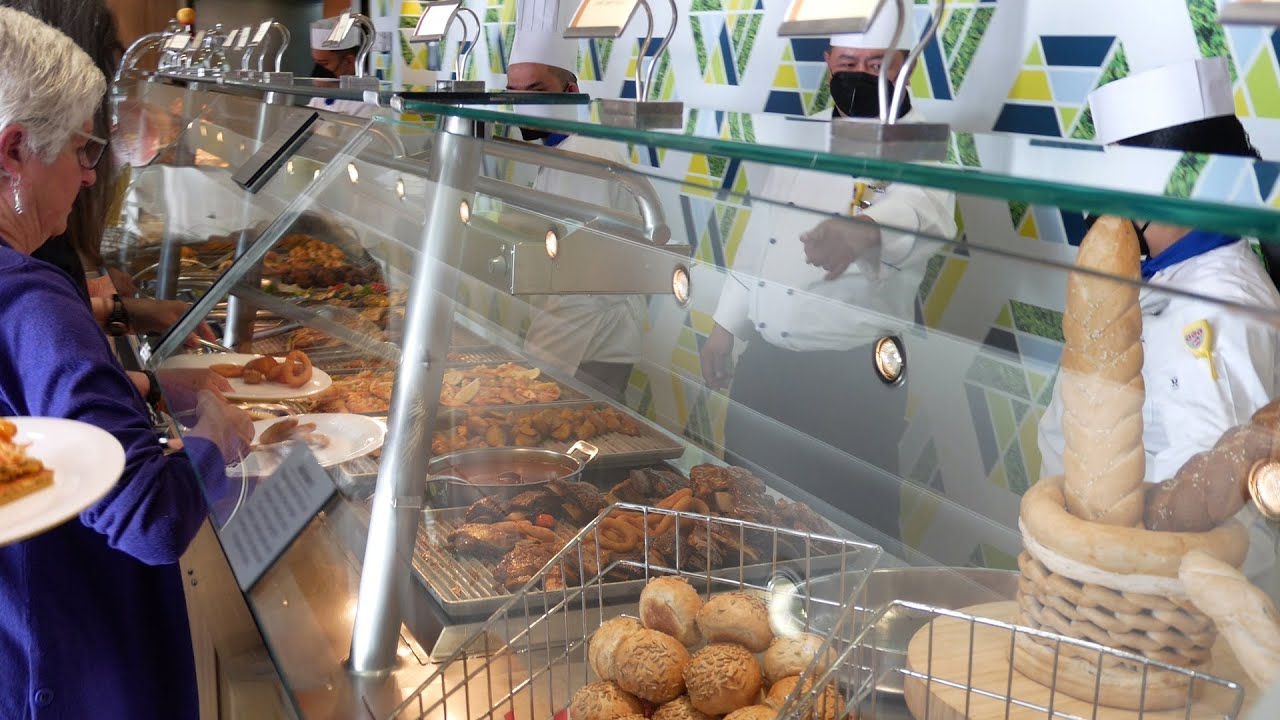 Tour Norwegian Cruise Line’s Dinner Buffet and see what the food is like! You’ll see items including the salad bar, bread & cheese, cold cuts, hot dishes, carving station, vegetarian food, fruits and dessert (including gluten-free & no sugar added).