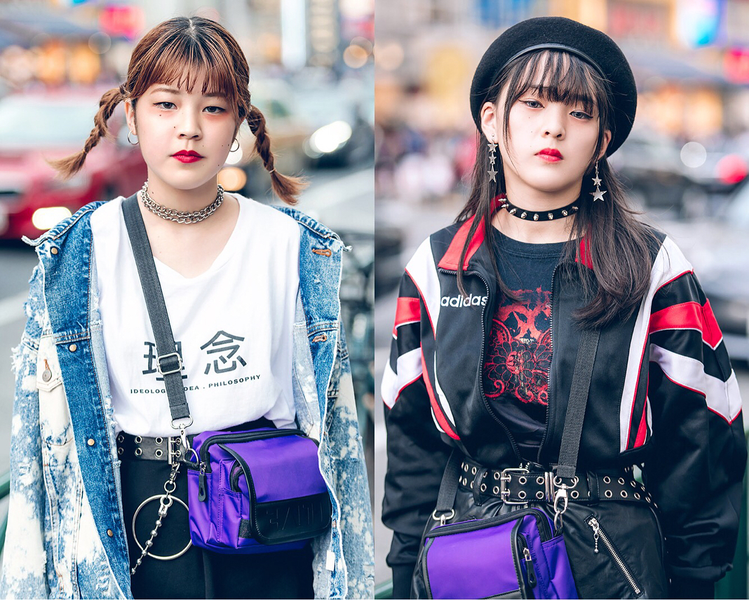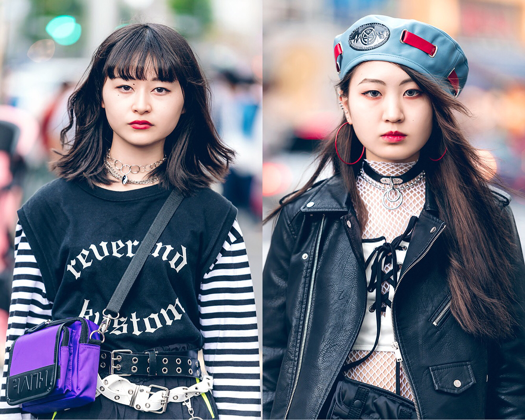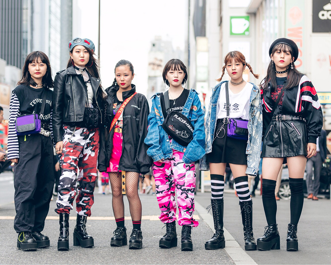 Japanese teens Miyu (@_______m_i_yu), Kunieda (@k_k_eda772200), Ema (@ema_world), Mitsuki, Megumi (@__meggumi), and Kaya (@kaya127s) in Harajuku wearing modern streetwear looks with items from Faith Tokyo, Bubbles, Demonia, 99%IS-, Rothco,More Than Dope, Never Mind the XU, Open The Door, and Places+Faces.