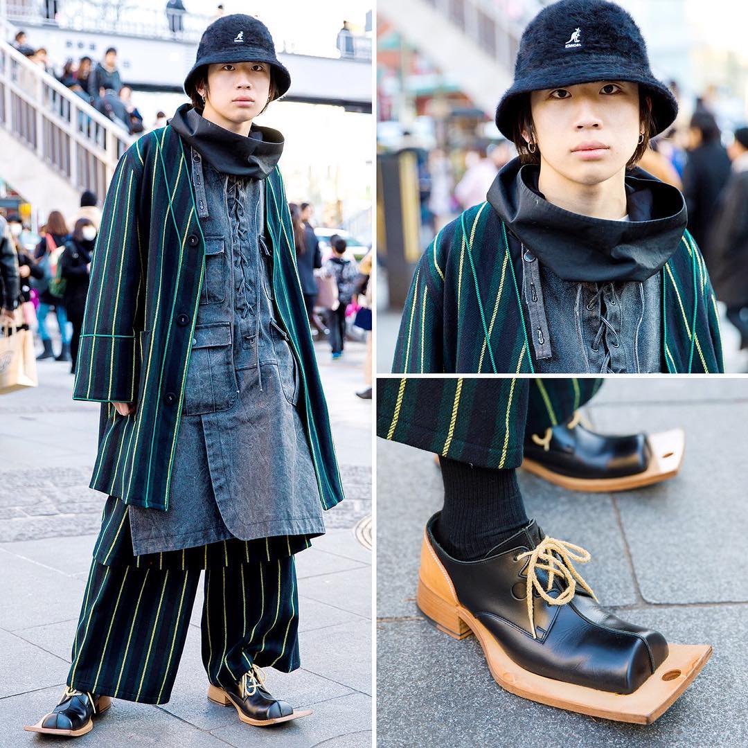 19-year-old Naoya (@xmx__708.t) on the street in Harajuku wearing a striped outfit by the Japanese streetwear brand @Kidill, vintage lace-up denim, vintage shoes with oversized wooden soles, and a faux fur Kangol bucket hat.