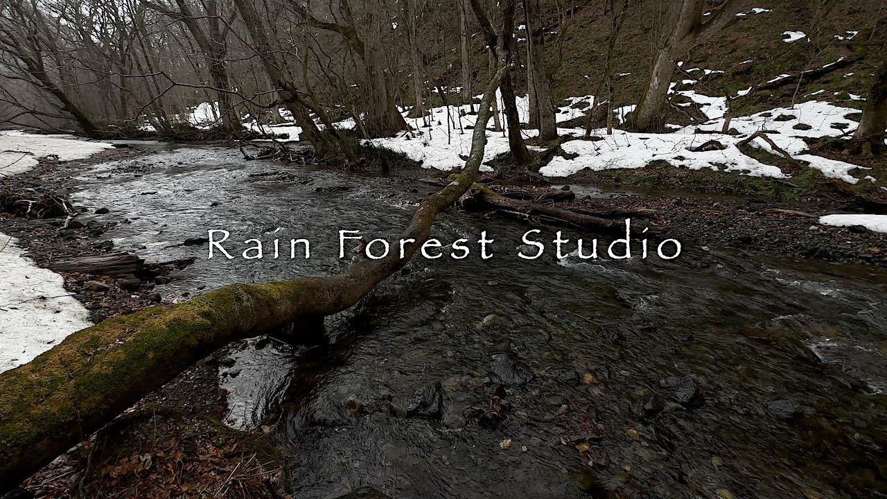 小雨の降る中、冬の終わりを迎えつつある奥入瀬渓流。