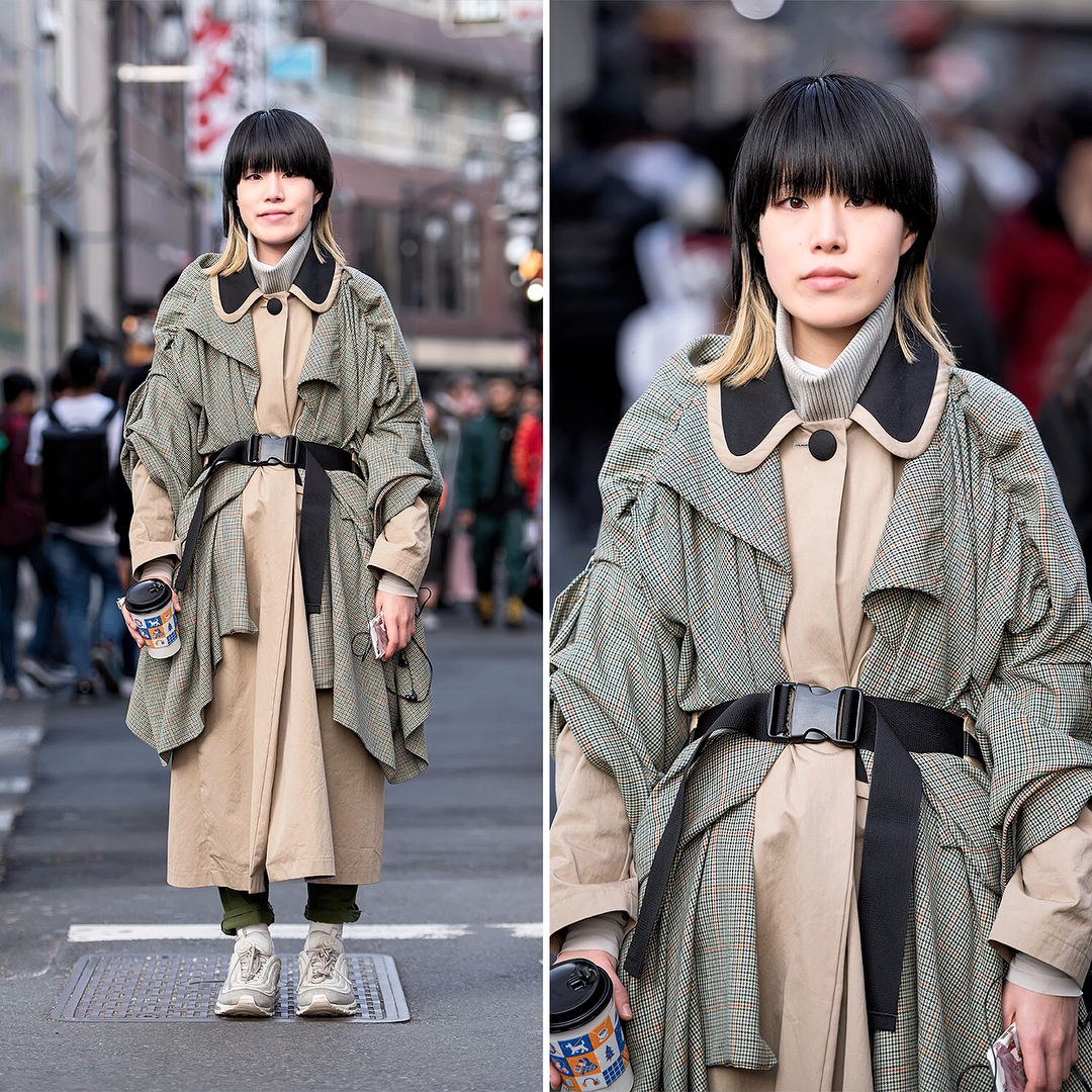 26-year-old Japanese writer Yoshiko on the street in Harajuku wearing layered coats by Bernhard Willhelm and Charles Anastase over a high neck top by Hatra, Toga pants, Nike sneakers, and a vintage waist bag by Porter Japan worn as a belt.