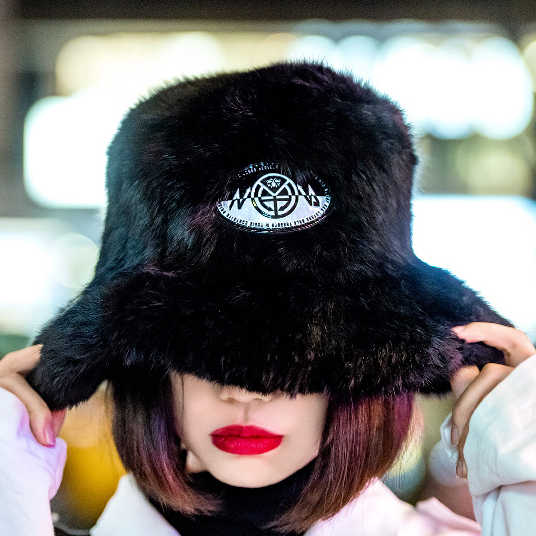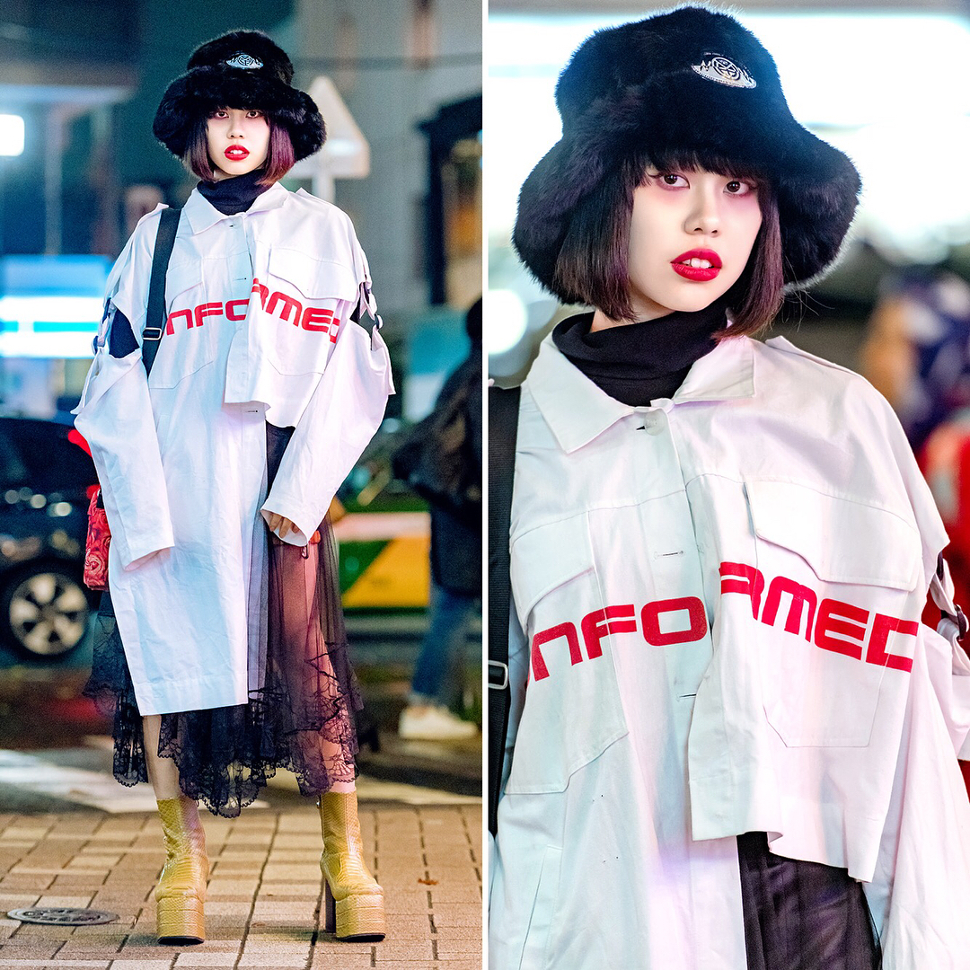 18-year-old Japanese student Sarah (@i_am_saaara) on the street in Harajuku wearing a deconstructed coat, faux fur hat, and shorts all by the Tokyo streetwear brand MYOB NYC, plus a vintage sheer skirt, snakeskin platform boots, and a floral Eastpak crossbody bag.