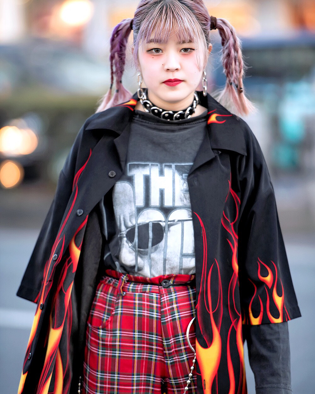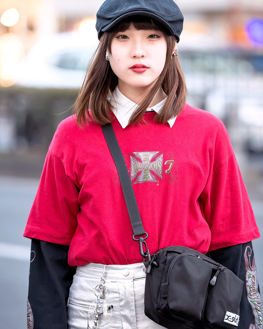 15-year-old Japanese students Megumi (@__meggumi) and Maria (@0_rei__maria) on the street in Harajuku. They’re wearing mostly vintage and resale fashion with items from West Coast Choppers, Faith Tokyo, Kawi Jamele, X-Girl, and Never Mind the XU.