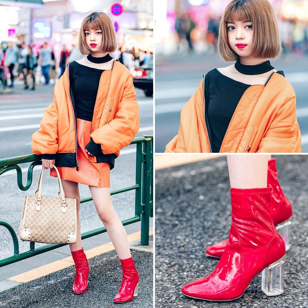 16-year-old Japanese-Thai high school student and YouTuber Ayumi (@ayumi_01310) on the street in Harajuku wearing an oversized orange bomber jacket with an orange skirt from Faith Tokyo, red patent clear heel booties, and a Gucci handbag.