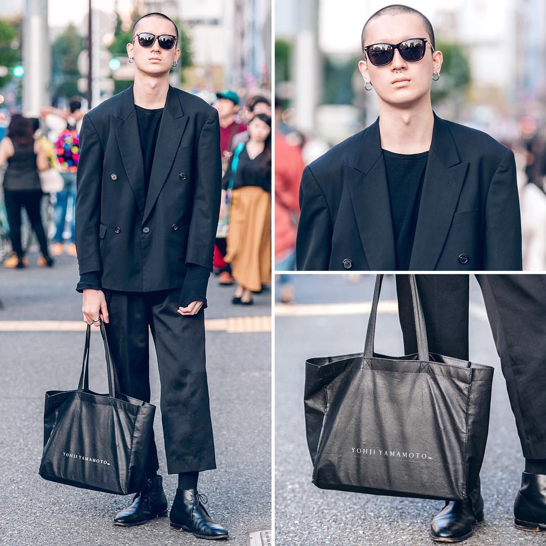 Japanese runway model Kazuki (@kazuki_ueda9612) on the street in Harajuku wearing an all black look by legendary designer Yohji Yamamoto. Tokyo FashionAloJapan.com