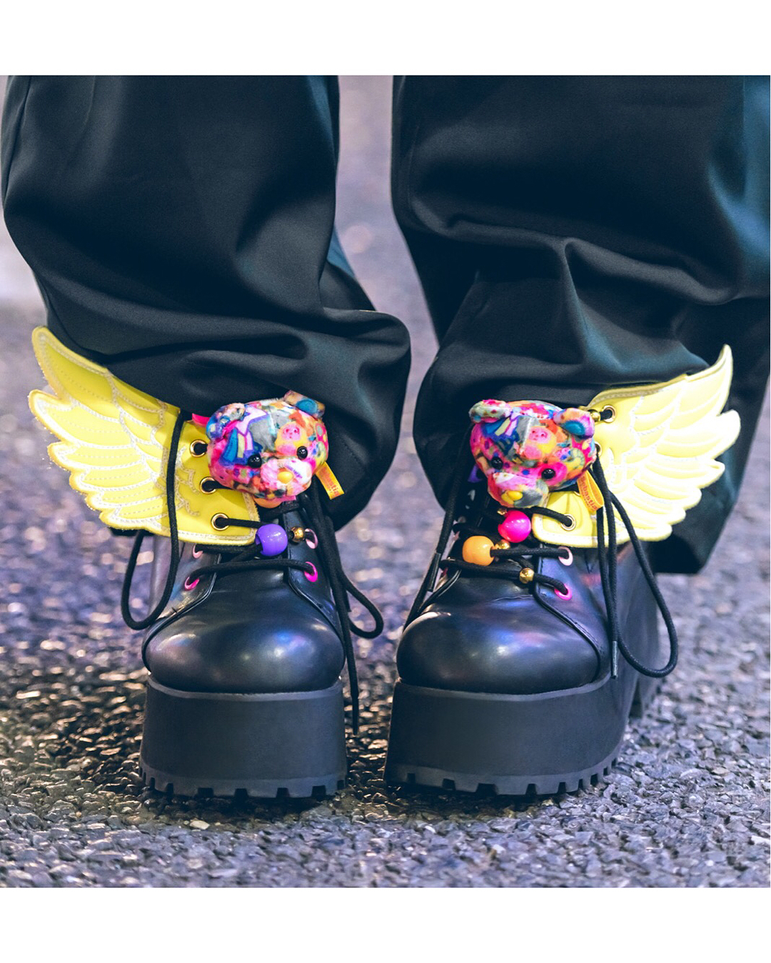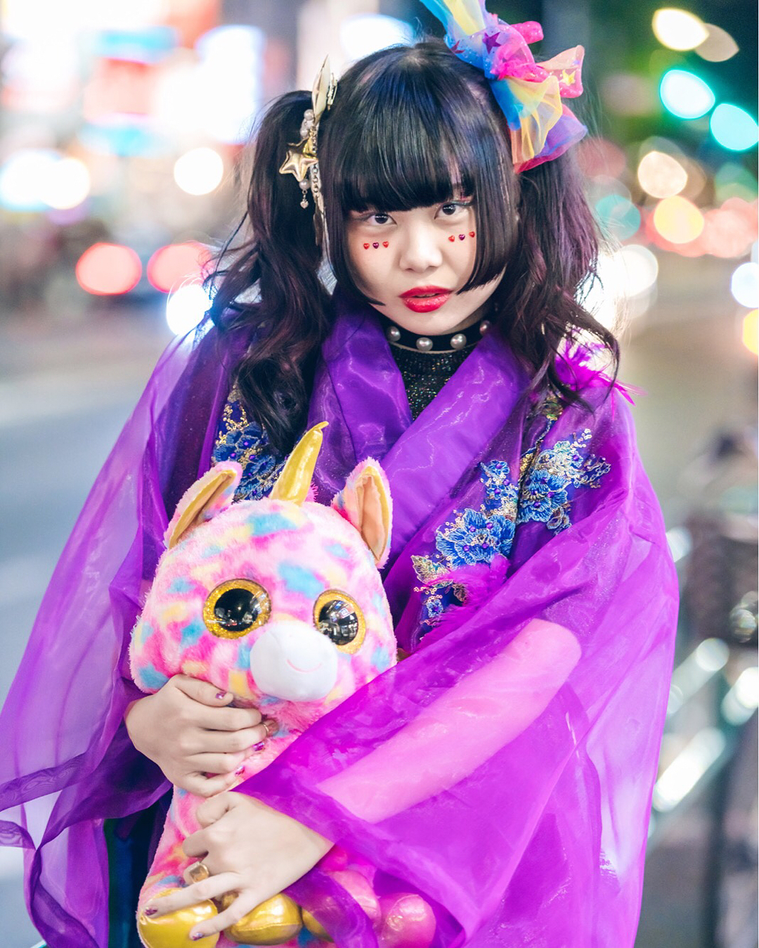 Japanese art student Chami (@chami8725) on the street in Harajuku at night wearing a kimono coat from the iconic Harajuku boutique Takenoko along with items from 6%DOKIDOKI, Kobinai, Spinns, and WEGO.