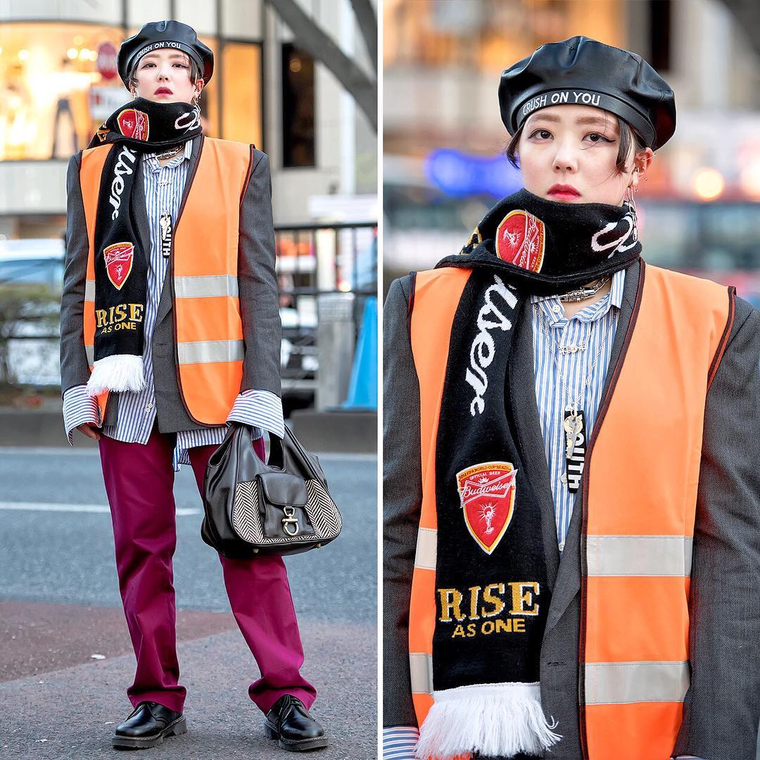 17-year-old Japanese student Lisa (@_rrr_gram) on the street in Harajuku wearing a vintage orange safety vest over a vintage blazer from Funktique Tokyo, vintage pants, vintage shoes, handmade accessories, and Oh Pearl Harajuku items.