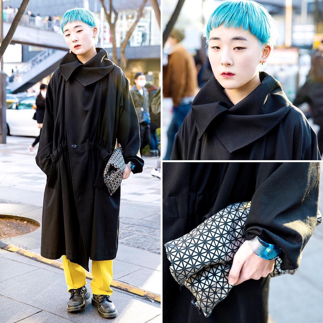 18-year-old Japanese beauty school student @Mai_Endo on the street in Harajuku wearing a minimalist look with fashion by legendary Japanese designers Yohji Yamamoto and Issey Miyake with Dr. Martens boots. Mai is one of the relatively rare Harajuku kids who is fluent in English.