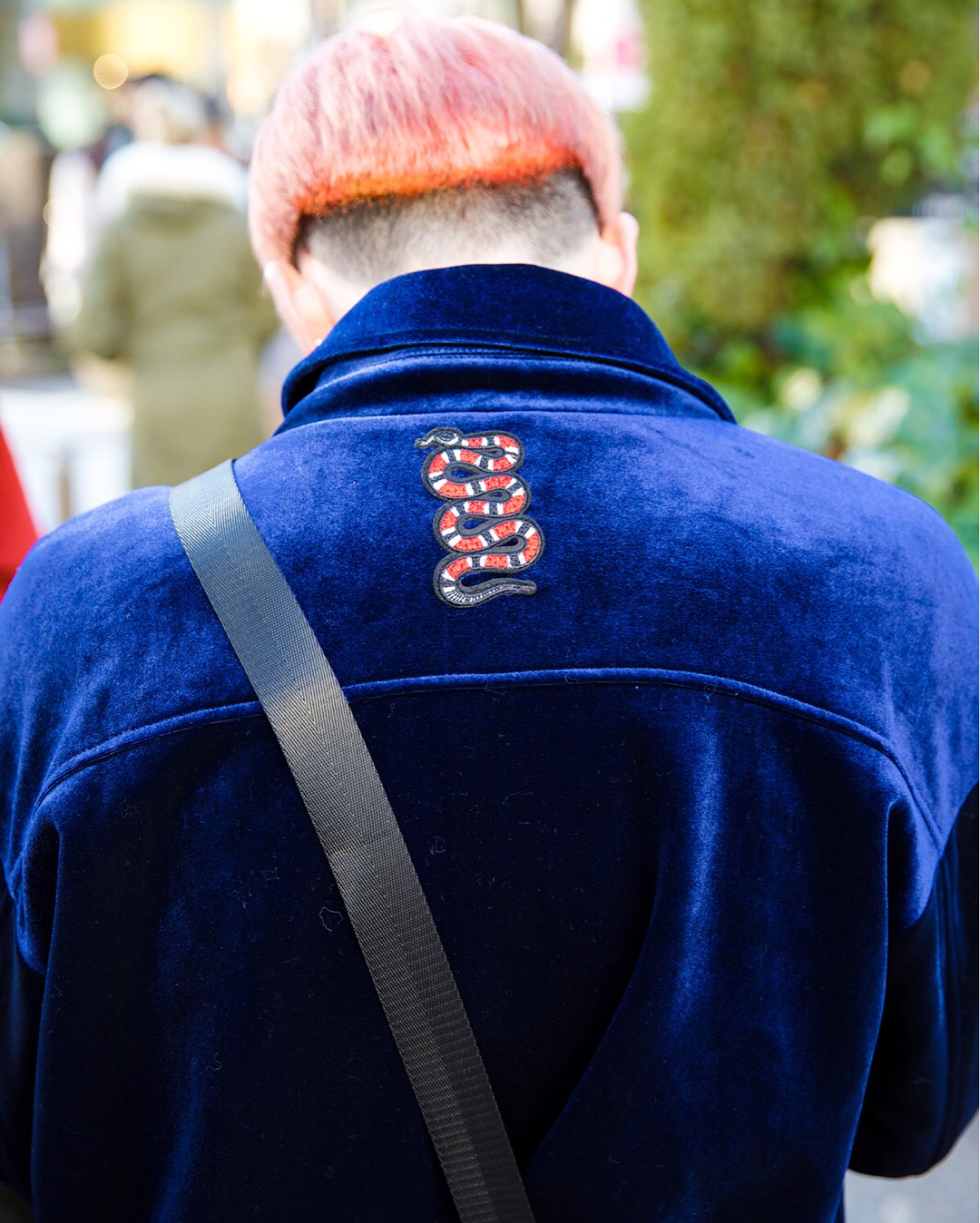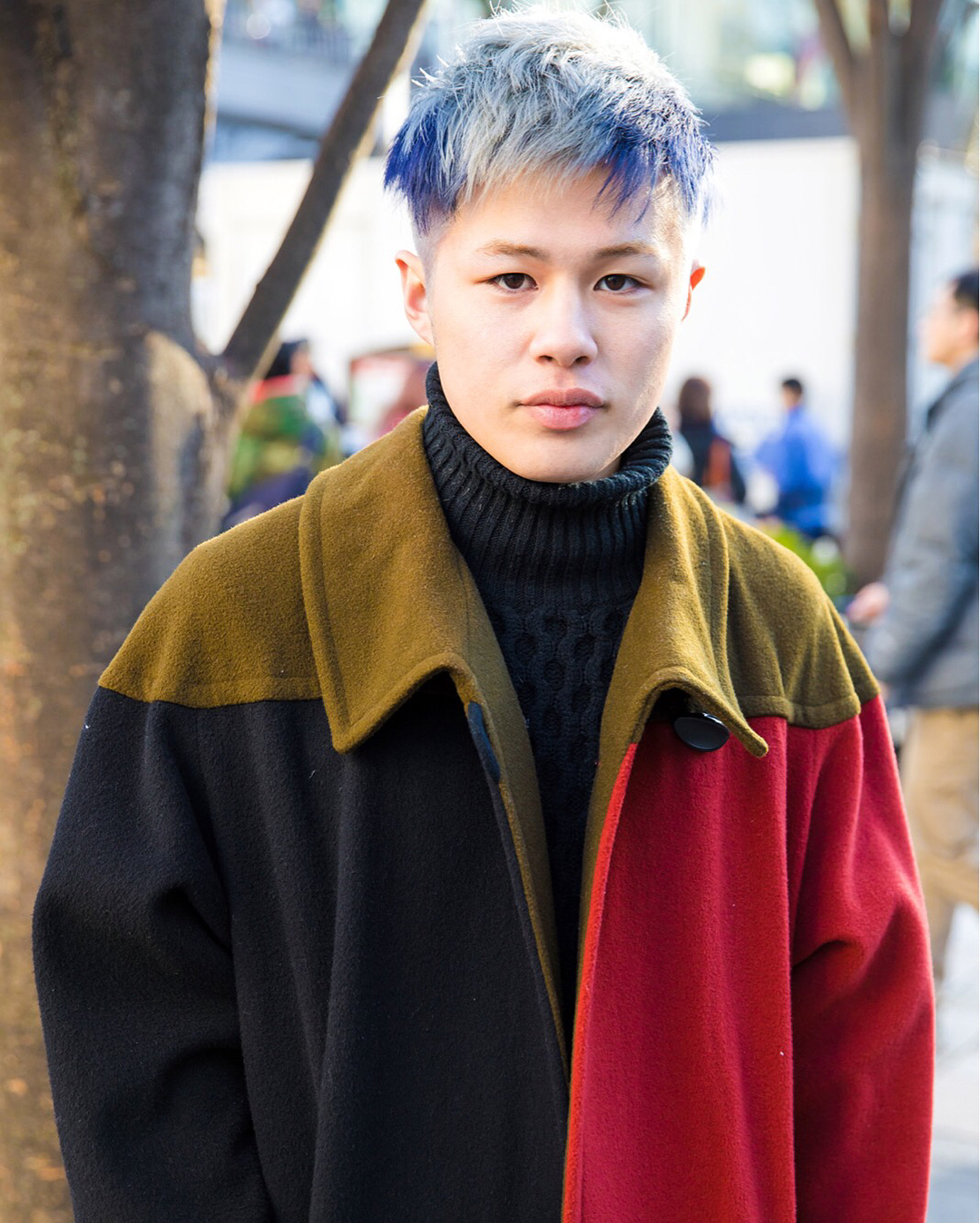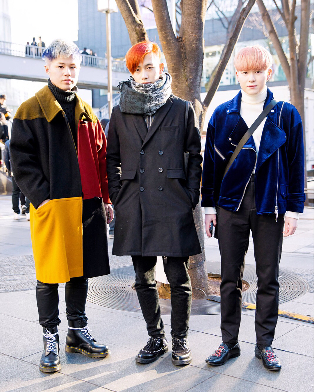 Ryoto (@rrrrr_yo07), Rinki (@aoxilinshu), and Reo (@reo242857) on the street in Harajuku with colorful hairstyles and winter fashion including items from vintage shops, Gucci, Zara, and Dr. Martens.