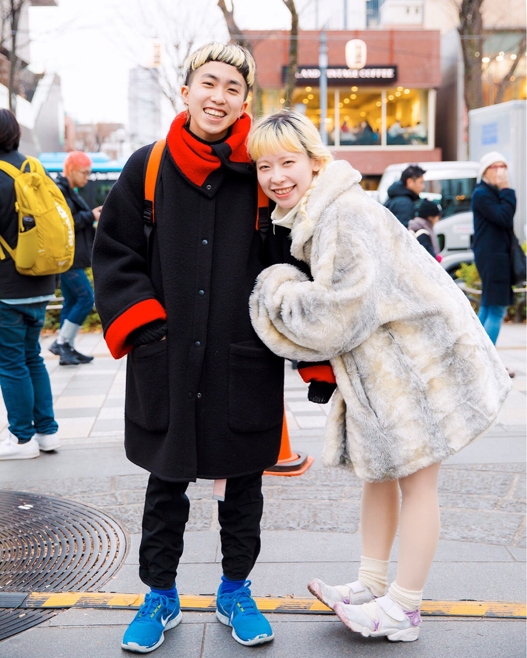 Fun Harajuku duo Rakuto (@raaakun7) and Syuko (@_syuko_) – he’s a hair stylist, she works in apparel – wearing vintage and resale winter street styles with a faux fur coat, sweater from The Virgin Mary (vintage shop), and Nike sneakers.
