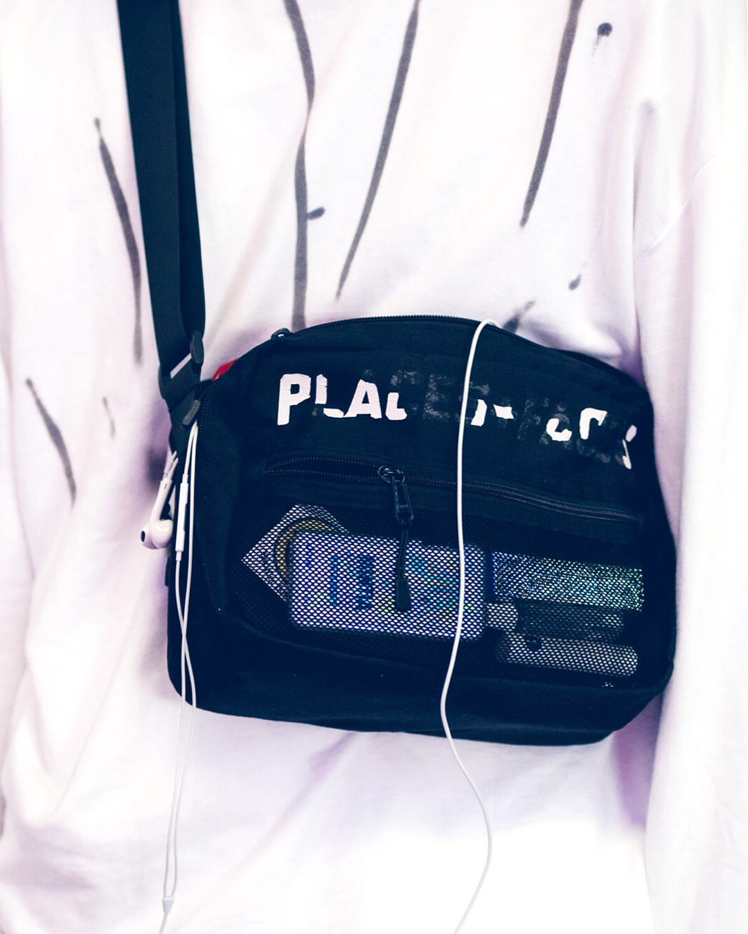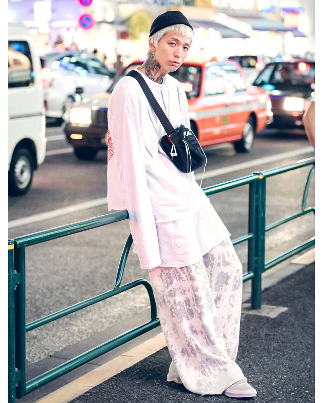 Takayuki (@taka_228) on the street in Harajuku wearing a monochrome style with a Refaitslaves sweatshirt, wide leg pants, Vans sneakers, and a Places+Faces crossbody bag.