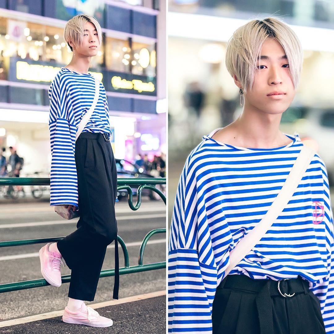 Japanese hair stylist @Rikiya.Ohashi on the street in Harajuku wearing an oversized striped top with Tunagi Japan pleated pants, pink Vans sneakers, a Peace Minus One belt, and Dog Kyoto bag.