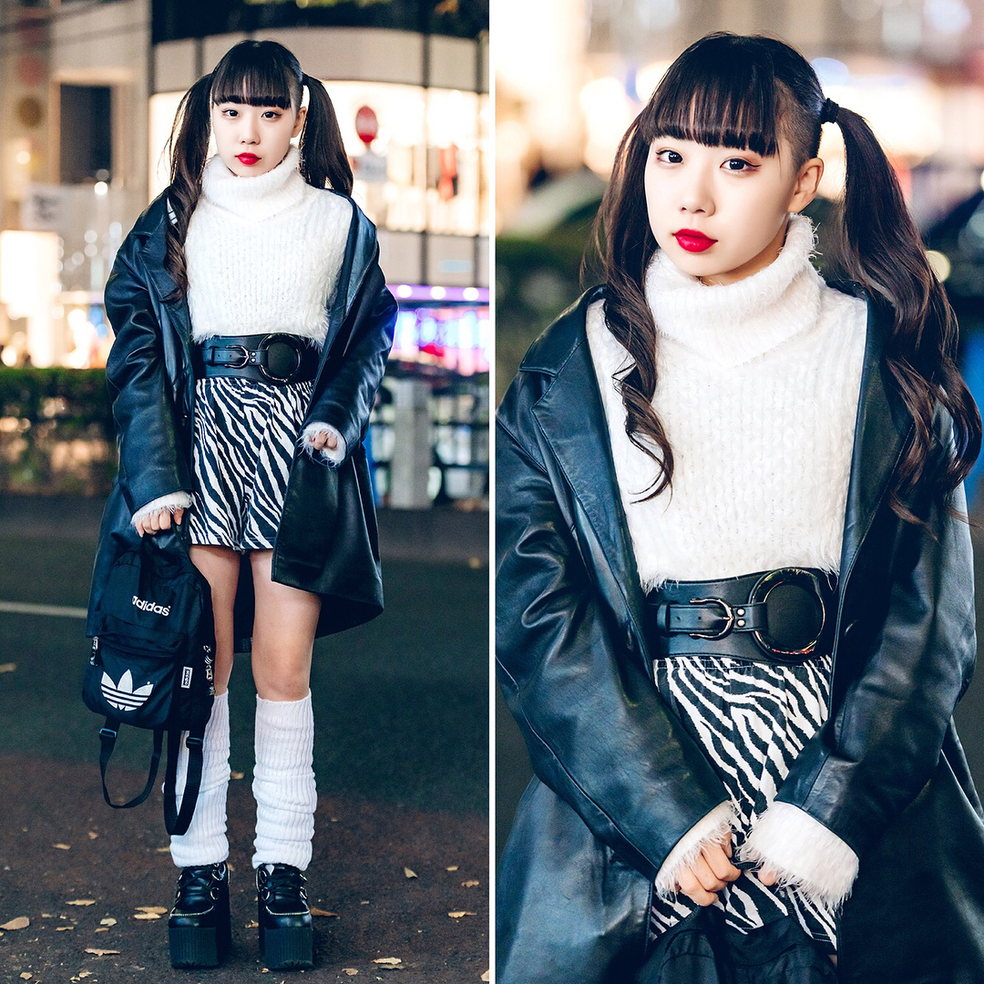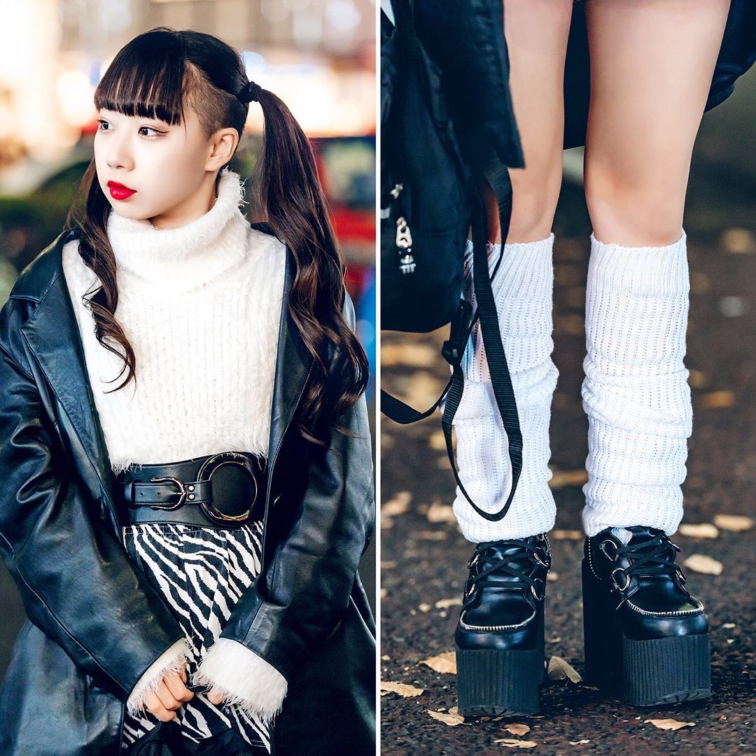 17-year-old Japanese high school student – and aspiring artist – Beni (@Beni9s) on the street in Harajuku wearing a monochrome look with loose socks and platform creepers featuring items from Dolls Kill, Kinji Harajuku, Adidas, and the Tokyo vintage shop Chicago.
