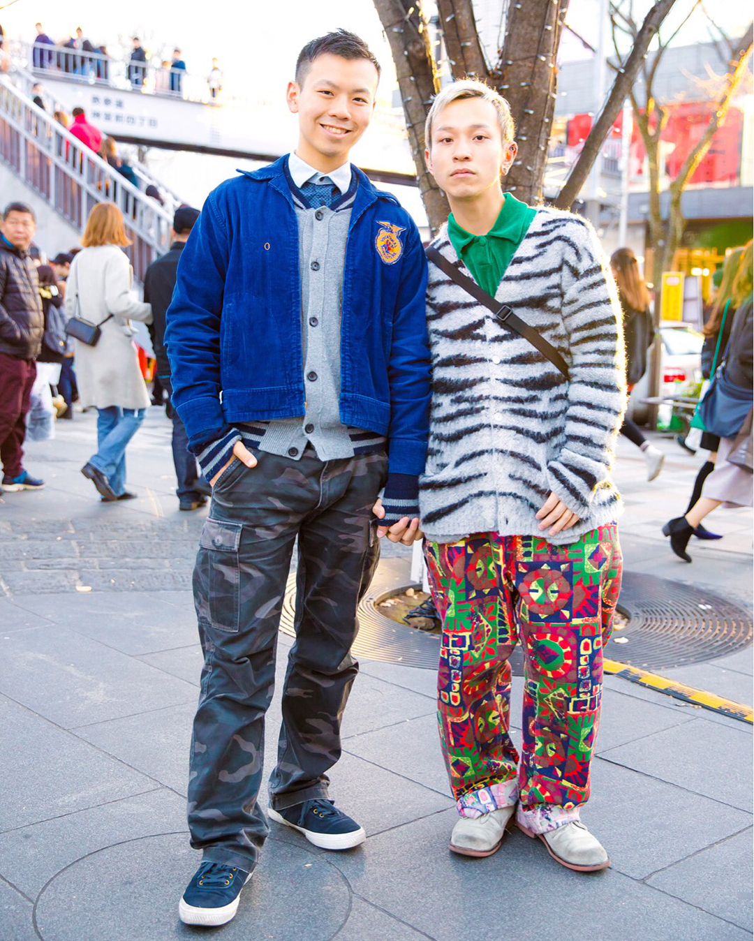 Stylish Japanese couple Kazushi (@kazuxgen) and Genchan (@gen_chan_) on the street in Harajuku wearing vintage fashion plus items by Polo Ralph Lauren, Avirex, Caroline Constas, Big Smith, and Manhattan Portage.