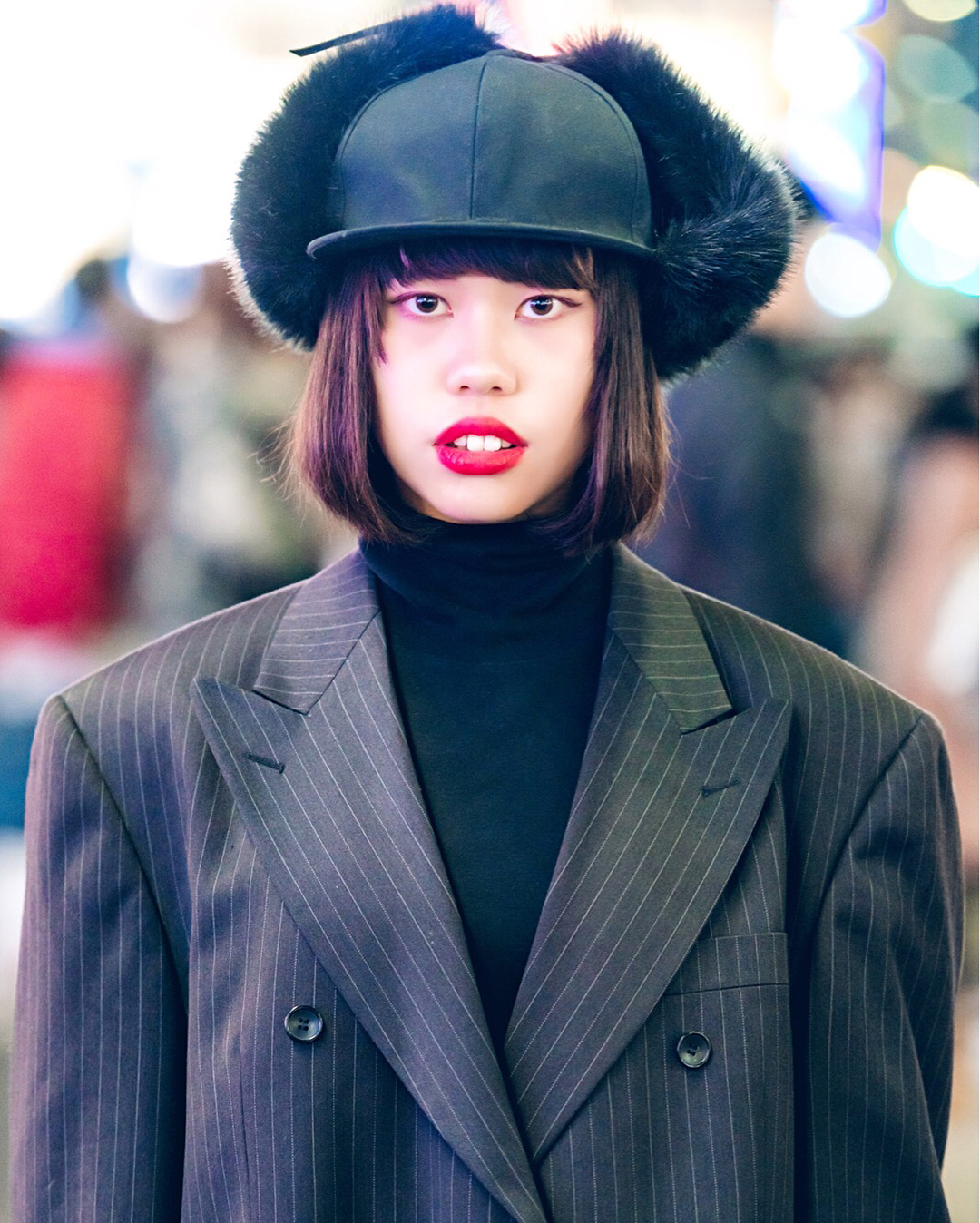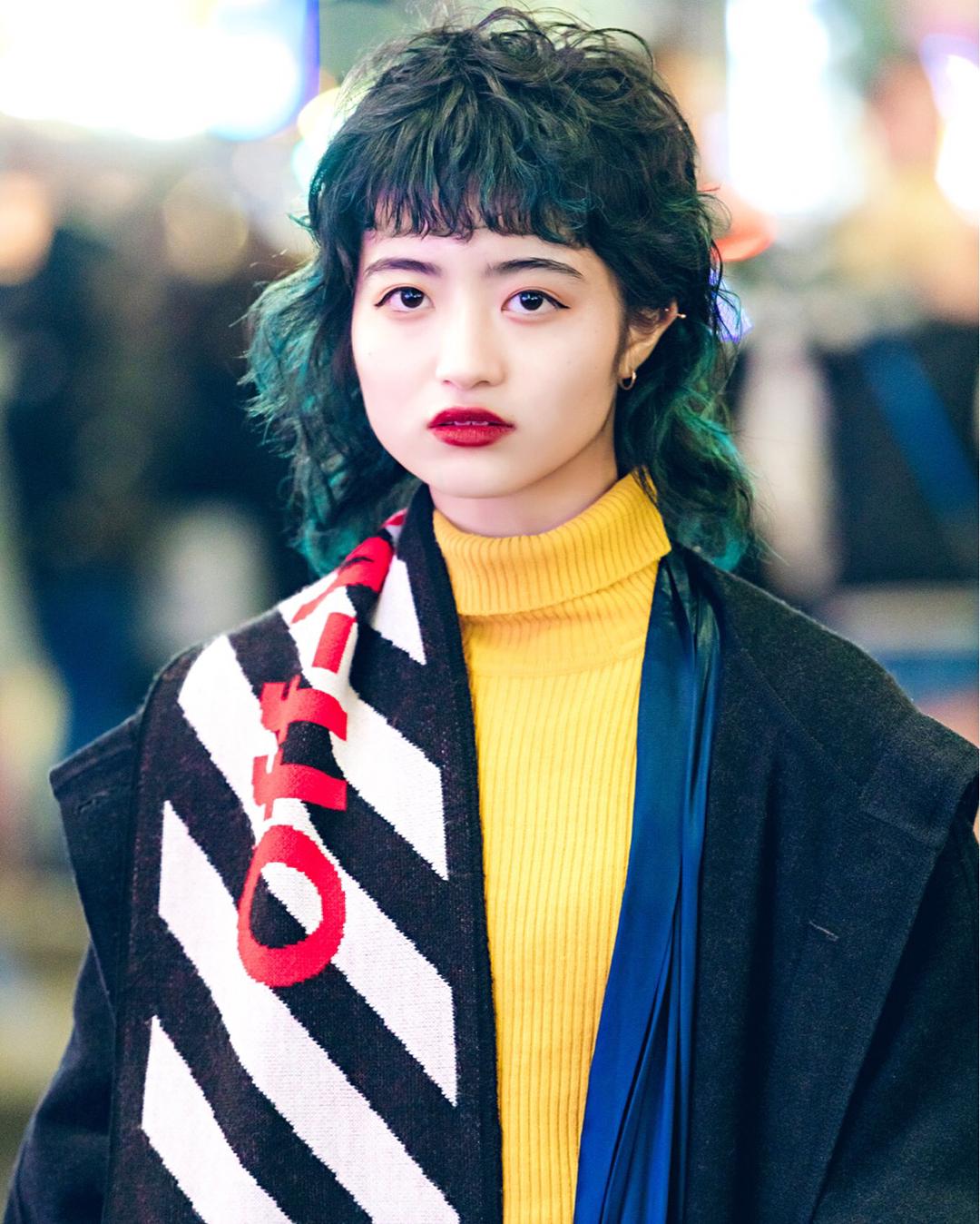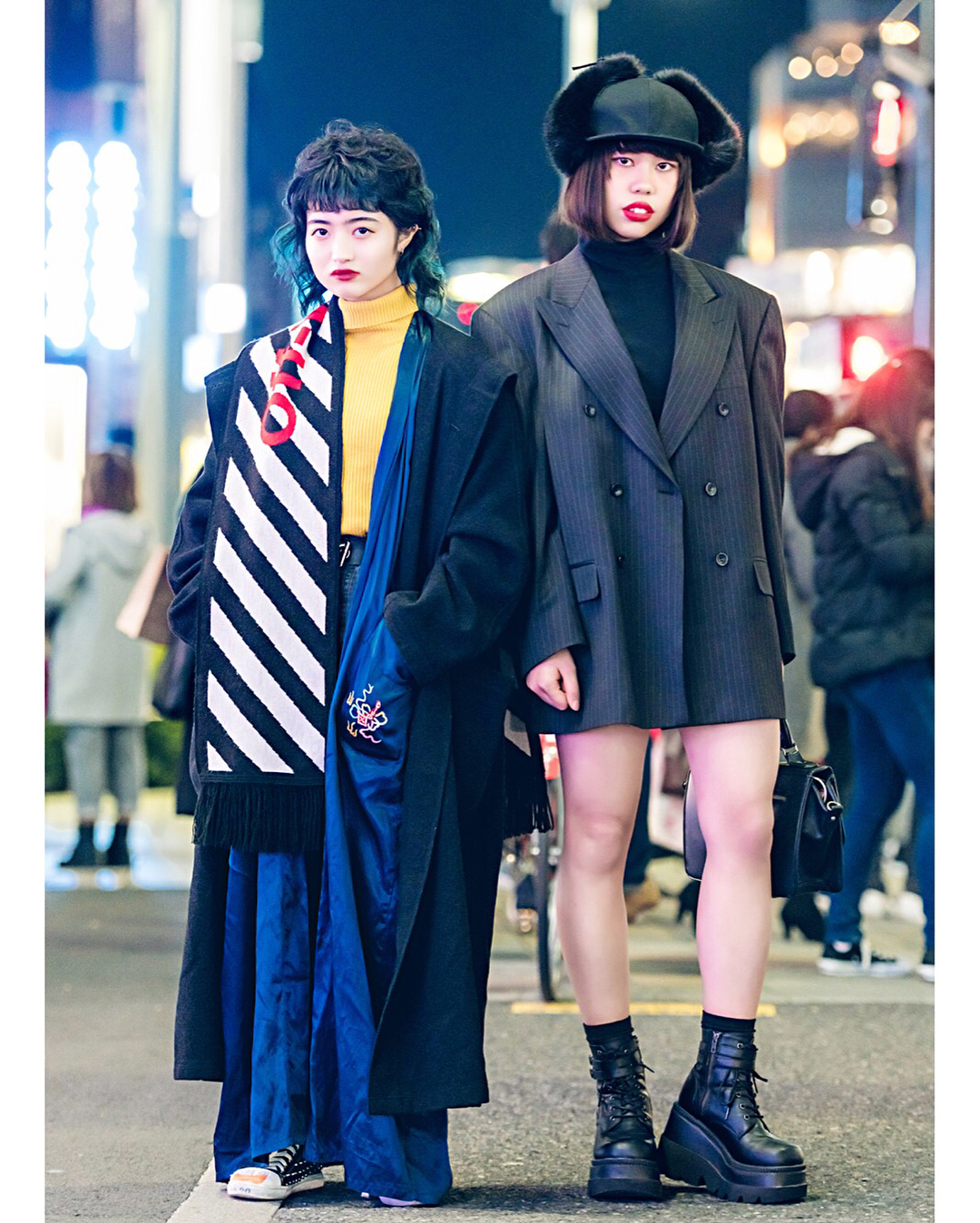 Japanese teens Rio (@ppg_dnc) and Sarah (@i_am_saaara) on the street in Harajuku at night wearing a mix of vintage and new fashion including items from Off-White, Kaka Vaka, Demonia, Pameo Pose, Armani, Benetton, and Avalanche.