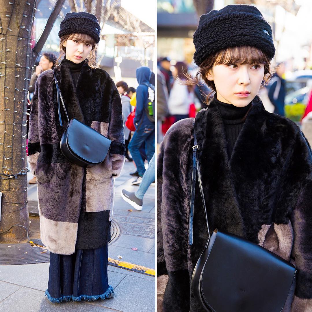 Yui Yoshikawa (@yui_yoshikawa) – the creative director of Japanese fashion brand Merry Jenny (@merryjenny_instagram) – on the street in Harajuku wearing a faux fur winter look with a long coat, wide leg raw hem denim, a faux fur hat, leather purse, and sneakers.