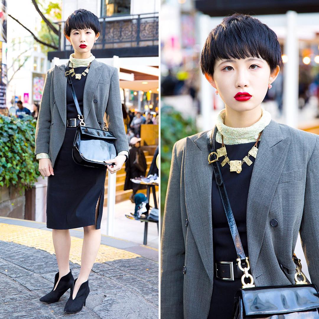 18-year-old Japanese student Meika (@garinton_meimei) on the street in Harajuku wearing a grey blazer from The Four-Eyed Tokyo over a black belted dress, pointy booties, and a black purse.