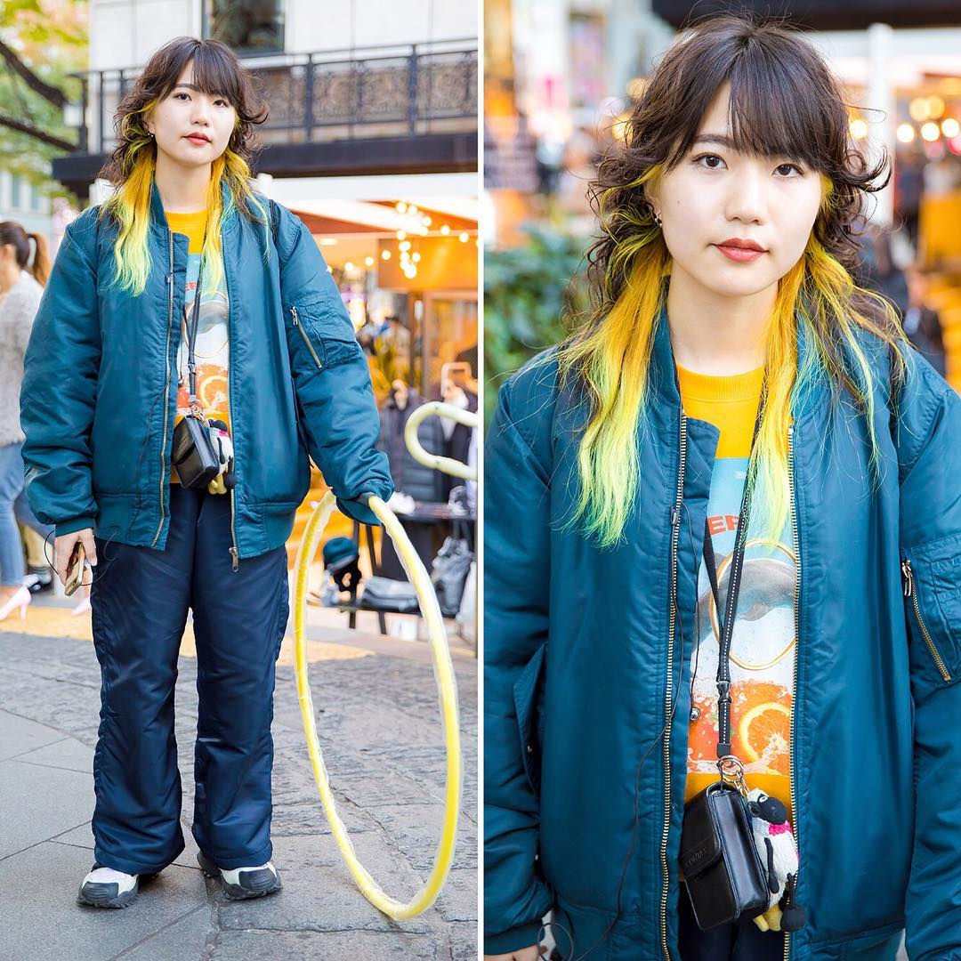 Japanese artist Masako Hirano (@cokepotato) – who was born in Japan, but grew up in Thailand – on the street in Harajuku wearing a vintage bomber jacket, Landlord New York pants, Adidas x Hyke sneakers, and a Nike sackpack.