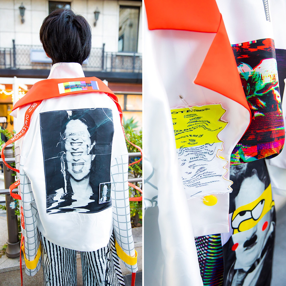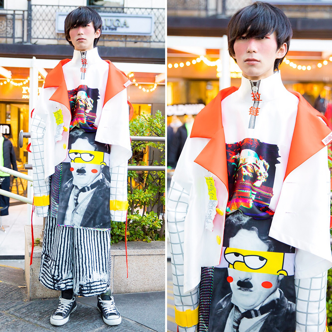 21-year-old Hiroki (@hirouuuki) on the street in Harajuku wearing an avant-garde style featuring a graphic jacket, top, and pants all by Seki (@seki_xi) along with Converse sneakers.