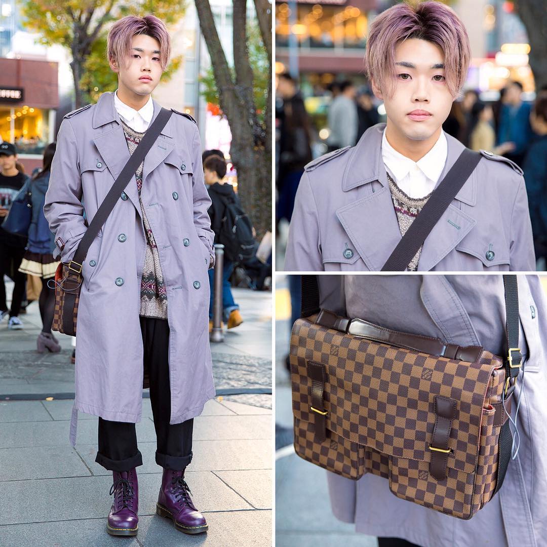 21-year-old Chanfuu (@_huupinkkk) on the street in Harajuku wearing a vintage purple coat over a sweater and collared shirt, cuffed Comme Des Garcons pants, purple Dr. Martens boots, and a Louis Vuitton bag.