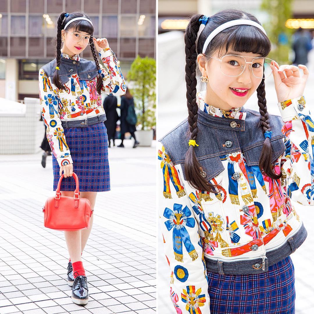 14-year-old aspiring Japanese actress A-Pon (@a_ponnnn) on the street in Tokyo wearing vintage mixed prints fashion and Chanel earrings. Tokyo FashionAloJapan.com