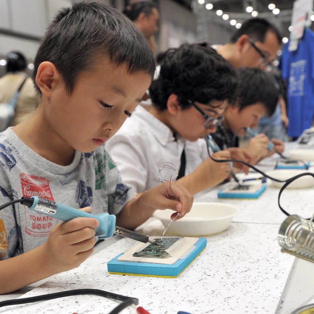 Children work on electronics at Maker Faire Tokyo 2016, which took place at Tokyo Big Sight on Aug. 6-7. The exhibition is a chance for designers and inventors — of all ages — to show off their latest projects. (Yoshiaki Miura photo) #Japan #Tokyo #MakerFaire