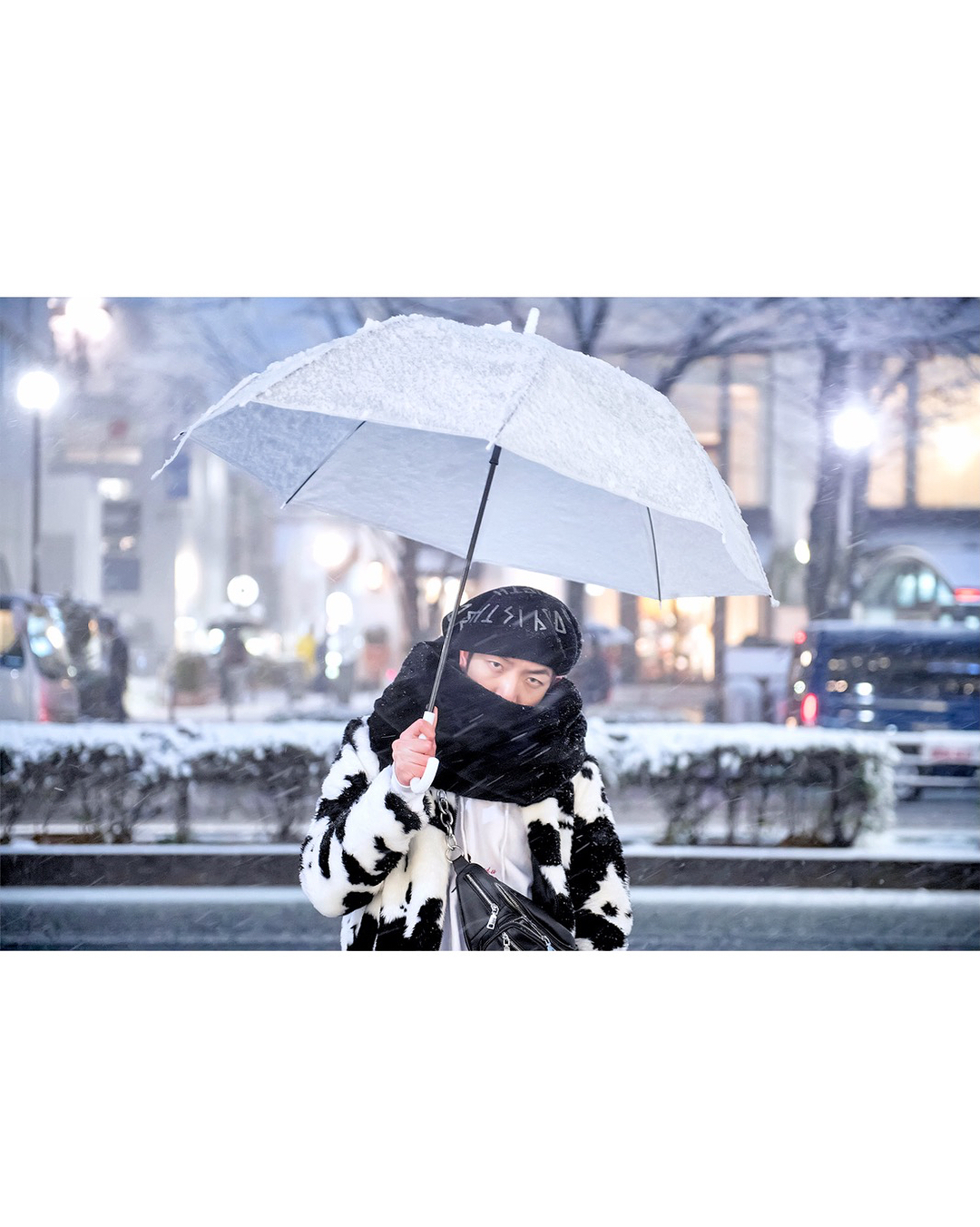 Kenta (@kenta_0120) wearing a snow-themed Harajuku street style – in the middle of yesterday’s Tokyo snowstorm – with items by Berberjin, UNIF, YRU, and Levi’s.