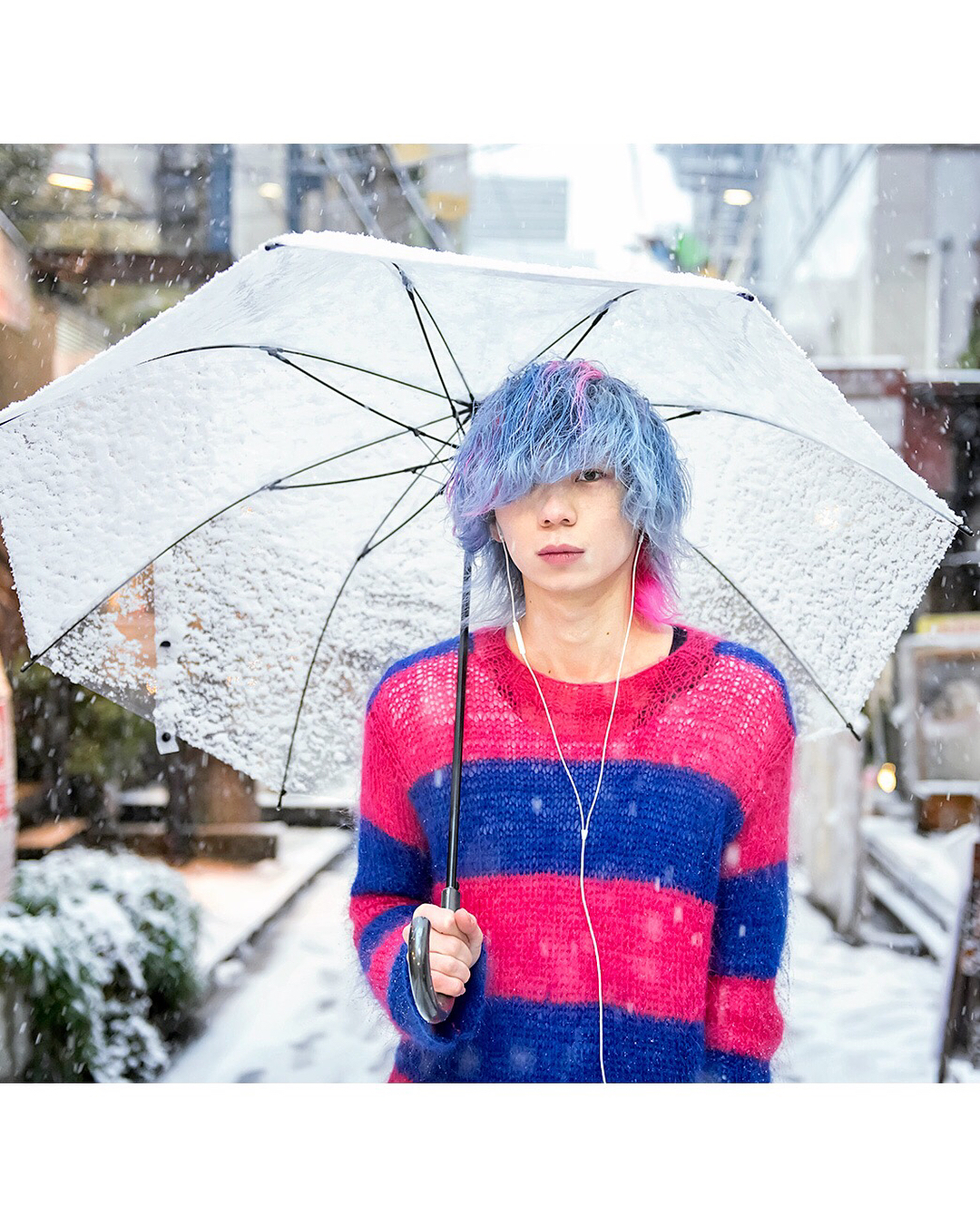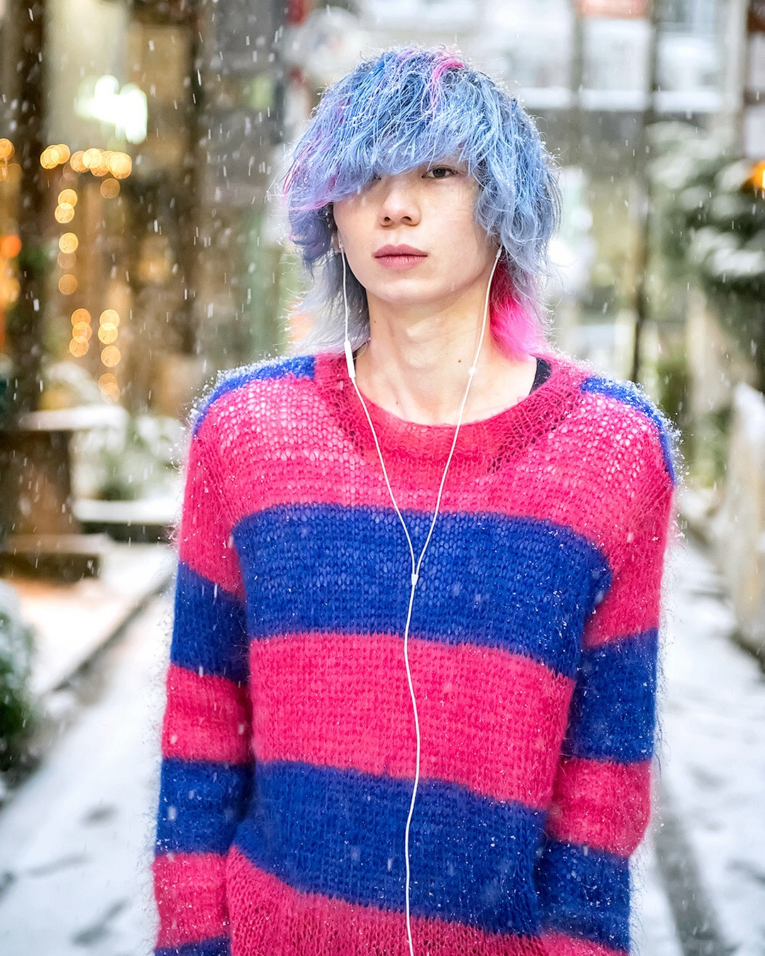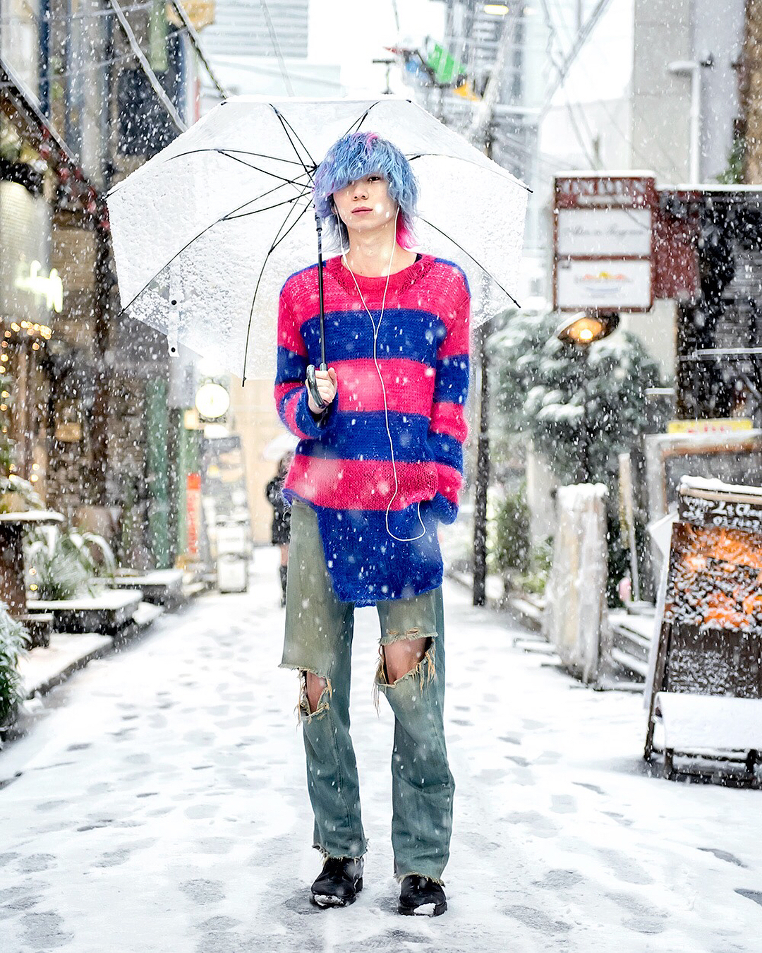 19-year-old Gero (@dodevader) on the street in Harajuku during today’s Tokyo snowstorm. He’s wearing a blue and pink sweater – matching his blue and pink hair – from Nincompoop Capacity, ripped Levi’s Red jeans, and Dr. Martens boots.