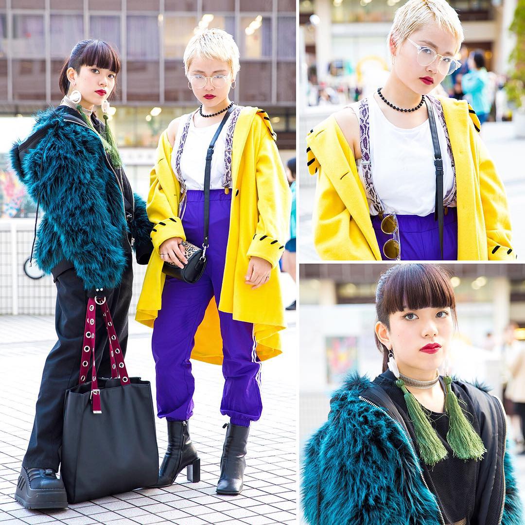 Japanese beauty school students 19-year-old Ryoka (@d_h_r_y_o_k_a) and 18-year-old Saki (@ochaki_99) on the street in Tokyo. Ryoka is wearing vintage faux fur with MYOB NYC, Dickies, and Demonia. Saki is wearing a vintage coat from Kinji Harajuku, H&M, ME, and Faith Tokyo.