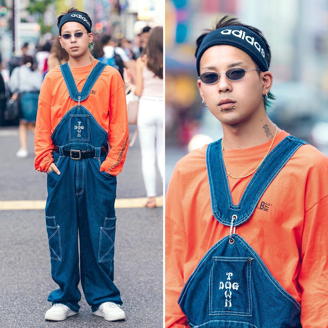 Yuuta (@1_peace_2) – aka Jimmy – on the street in Harajuku wearing Dogtown denim overalls over a sweatshirt by the Japanese streetwear brand MYOB NYC, Nike sneakers, and an Adidas headband.