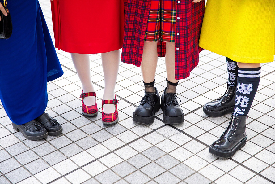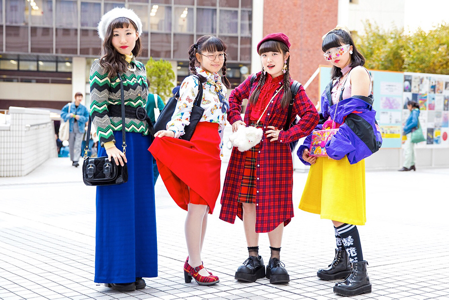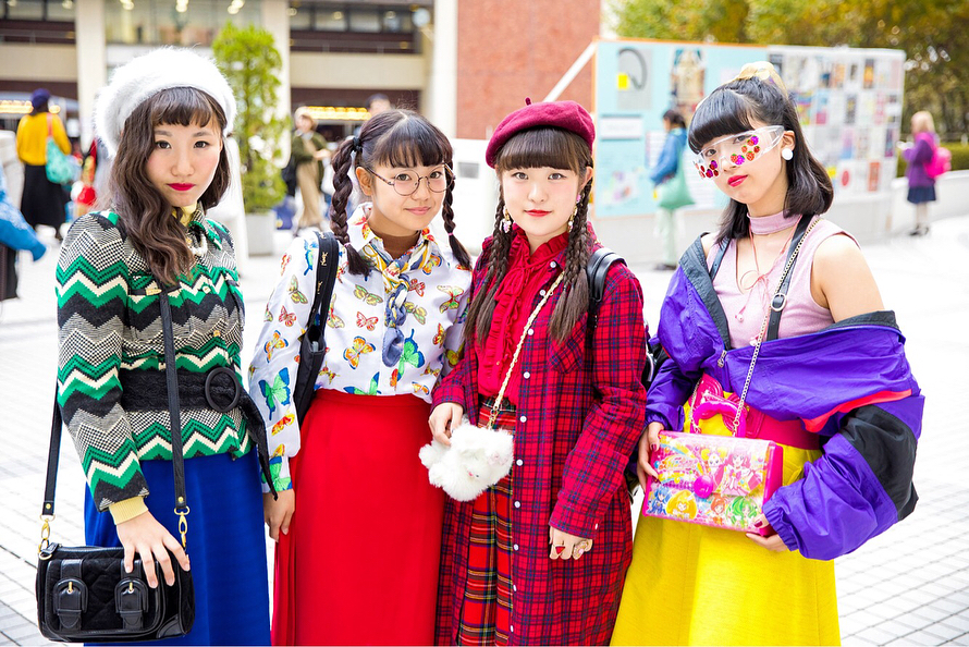 Japanese high school students 16-year-old Riripon (@riripon0102), 16-year-old Sponge Miyuu (@sponge_miyuu), 16-year-old Miori (@miori06kidz), and 15-year-old Mawonini (@mawoniprincess) wearing bold colors and prints on the street in Tokyo with items from Ashinaga Ojisan, San-Biki No Koneko, Thank You Mart, YSL, Hermes, Kinji Harajuku, Never Mind the XU, Swimmer, Dr. Martens, Faith Tokyo, and other vintage shops.